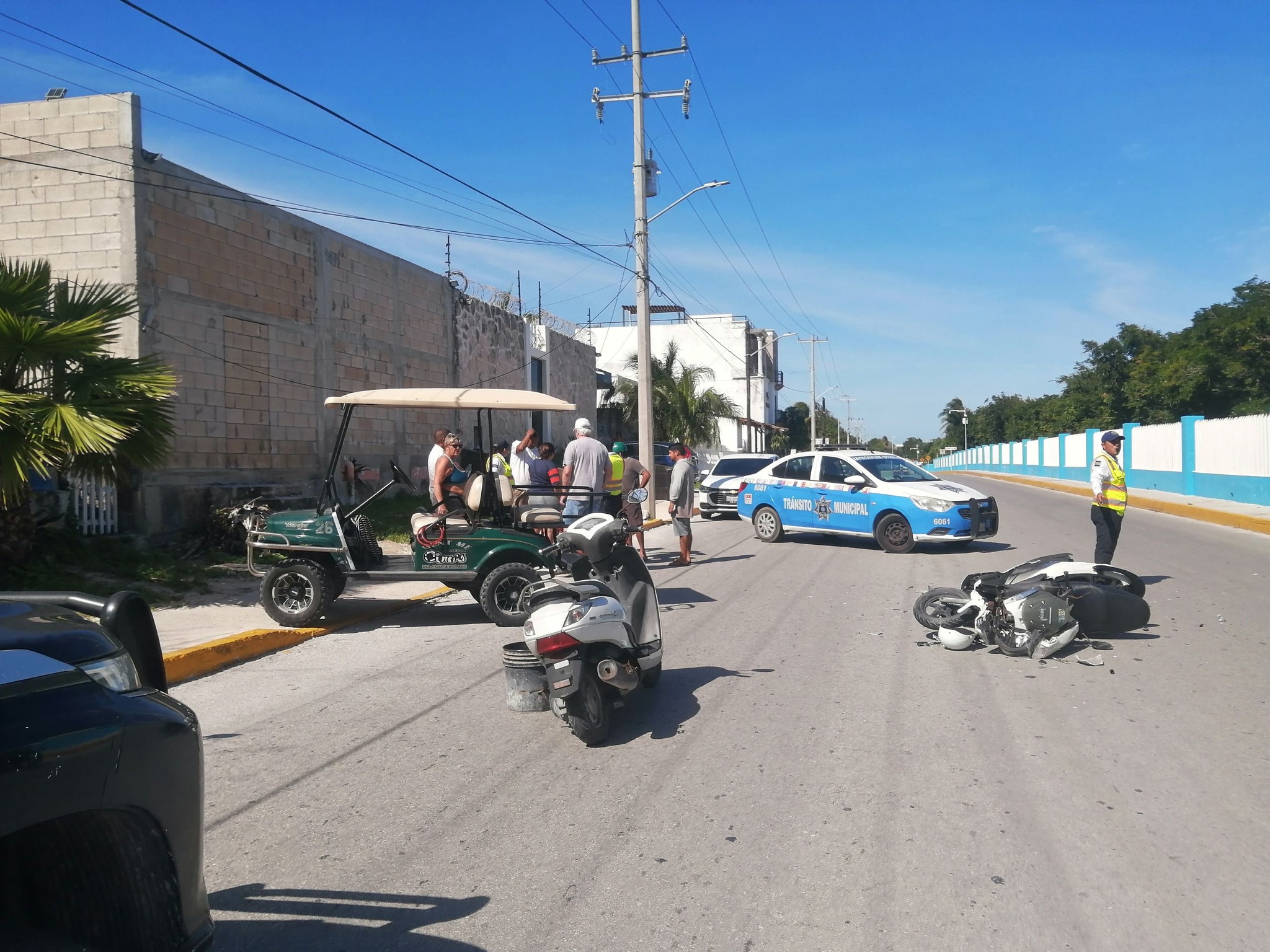 Los hechos se registraron pasado el mediodía de este viernes e involucraron al carrito de golf de la arrendadora Ciro’s, con número económico 26 y placas de circulación B-015-TMR y a una motocicleta Honda color blanco, de la que no se tienen mayores datos.
