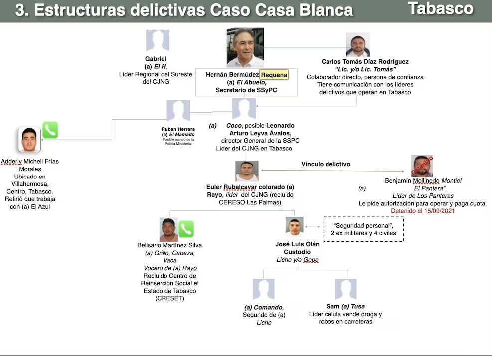 El informe incluye organigramas que describen estructuras delictivas en municipios como Reforma (Chiapas), Huimanguillo, Cárdenas y Paraíso (Tabasco), donde Bermúdez aparece vinculado con funcionarios locales y elementos penitenciarios. También se menciona a Carlos Tomás Díaz Rodríguez, alias “Tomasín”, quien recién fue vinculado a proceso en 2025 por lavado de dinero y extorsión.