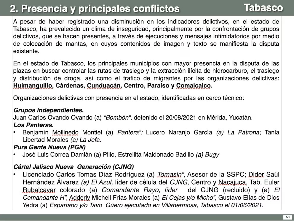 En dicho diagnóstico se menciona a Hernán Bermúdez Requena como figura clave en las operaciones delictivas en Tabasco y Chiapas, según los documentos revisados por Montenegro.
