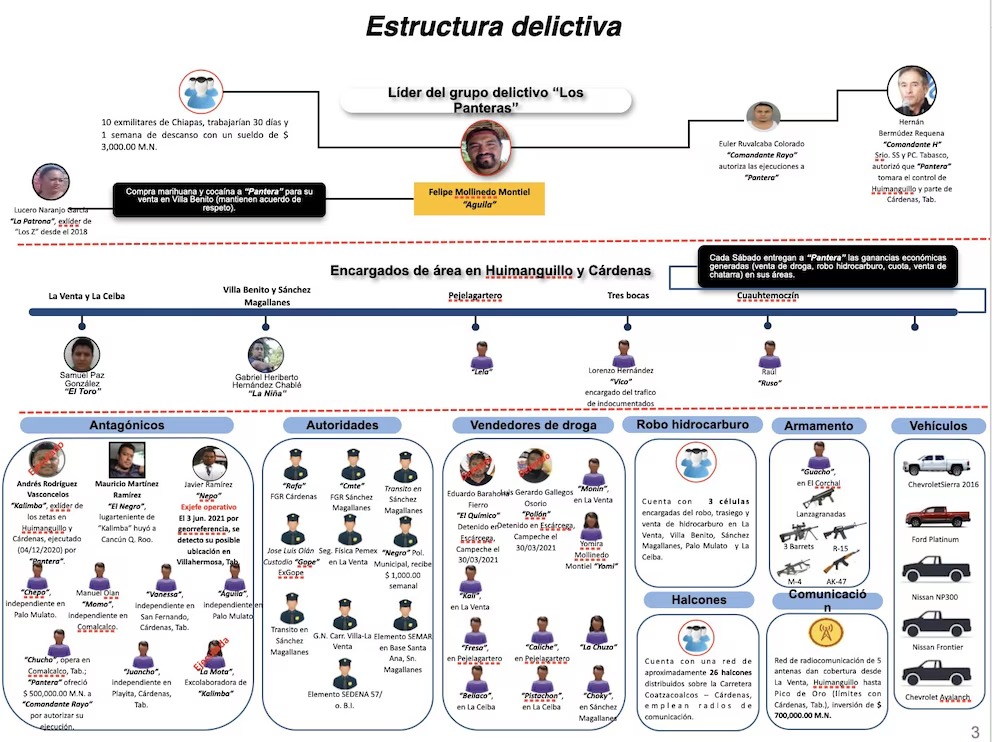 Los documentos ventilados por el periodista detallan la presunta coordinación de Bermúdez con operadores como Benjamín Mollinedo Montiel, “El Pantera”, y su hermano Felipe, “El Águila”, quienes reclutaban a exmilitares de Chiapas para diversas tareas dentro de la estructura criminal, incluyendo el robo de hidrocarburos.