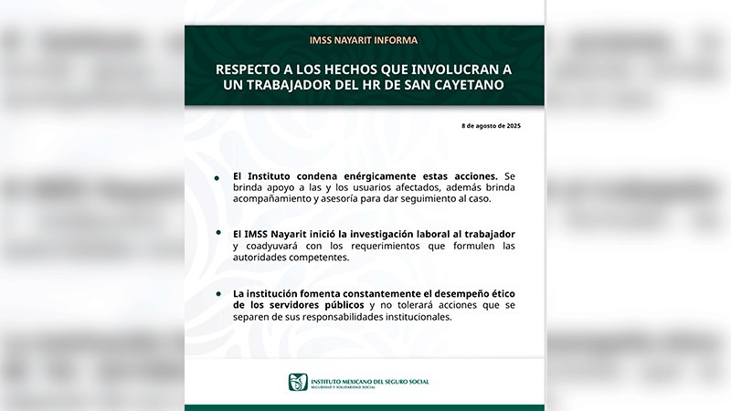En tanto, el IMSS difundió un comunicado en el cual señala que está abierto a toda investigación hasta que se determine todo el proceso legal que se debe de tener en estas situaciones.