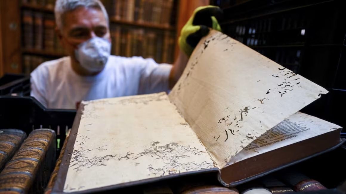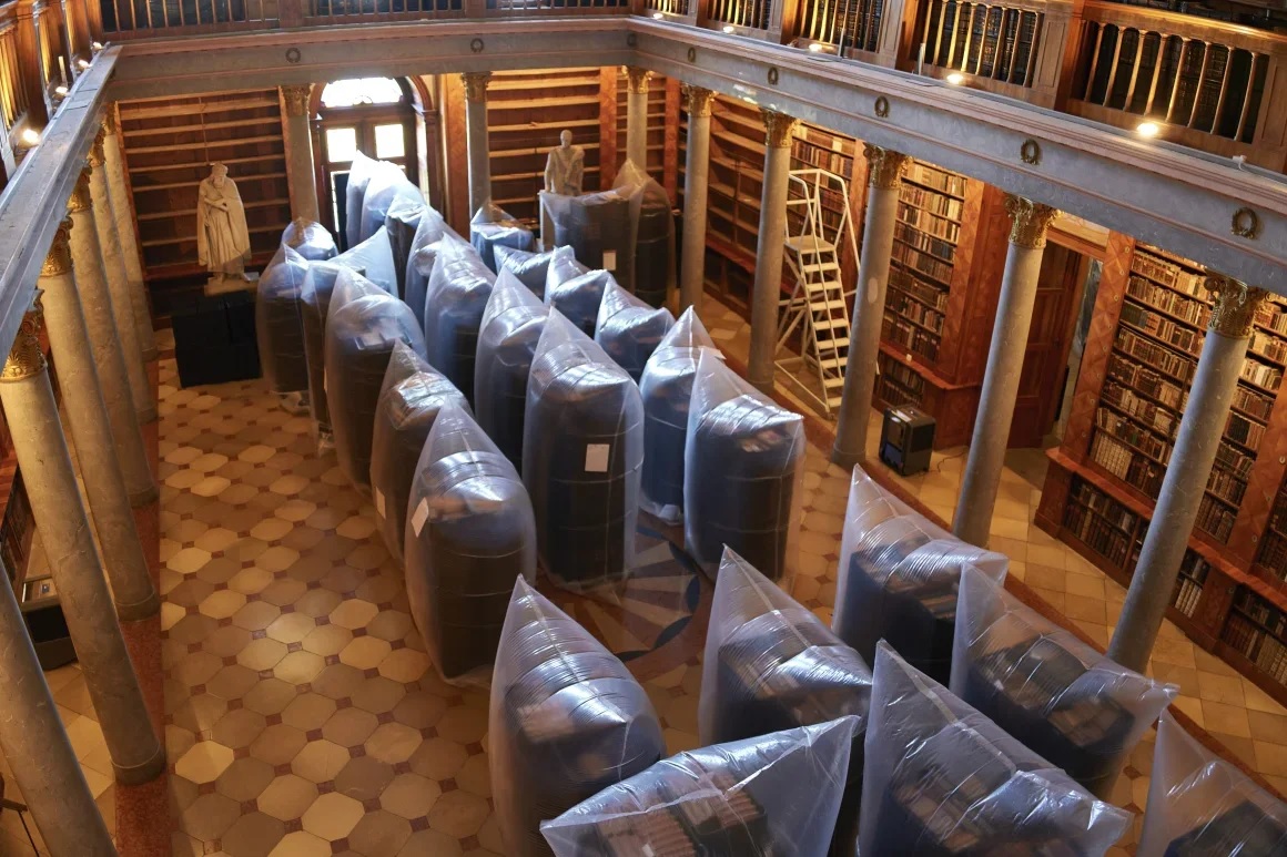 Los restauradores están retirando de sus estanterías unos 100.000 libros encuadernados a mano y colocándolos cuidadosamente en cajas, iniciando un proceso de desinfección que tiene como objetivo matar a los pequeños escarabajos que se esconden en ellos.