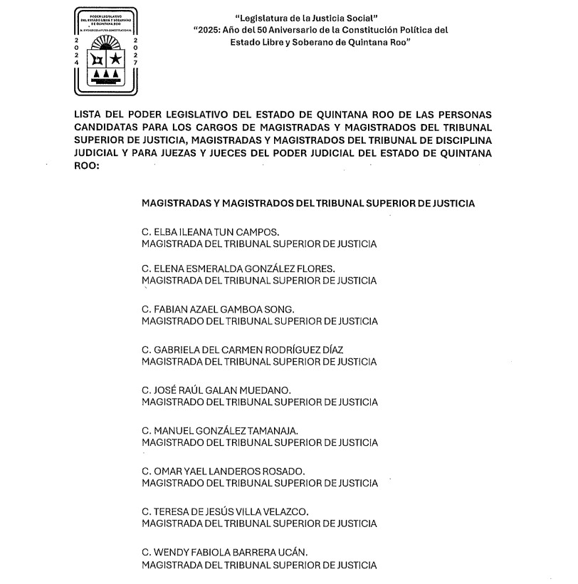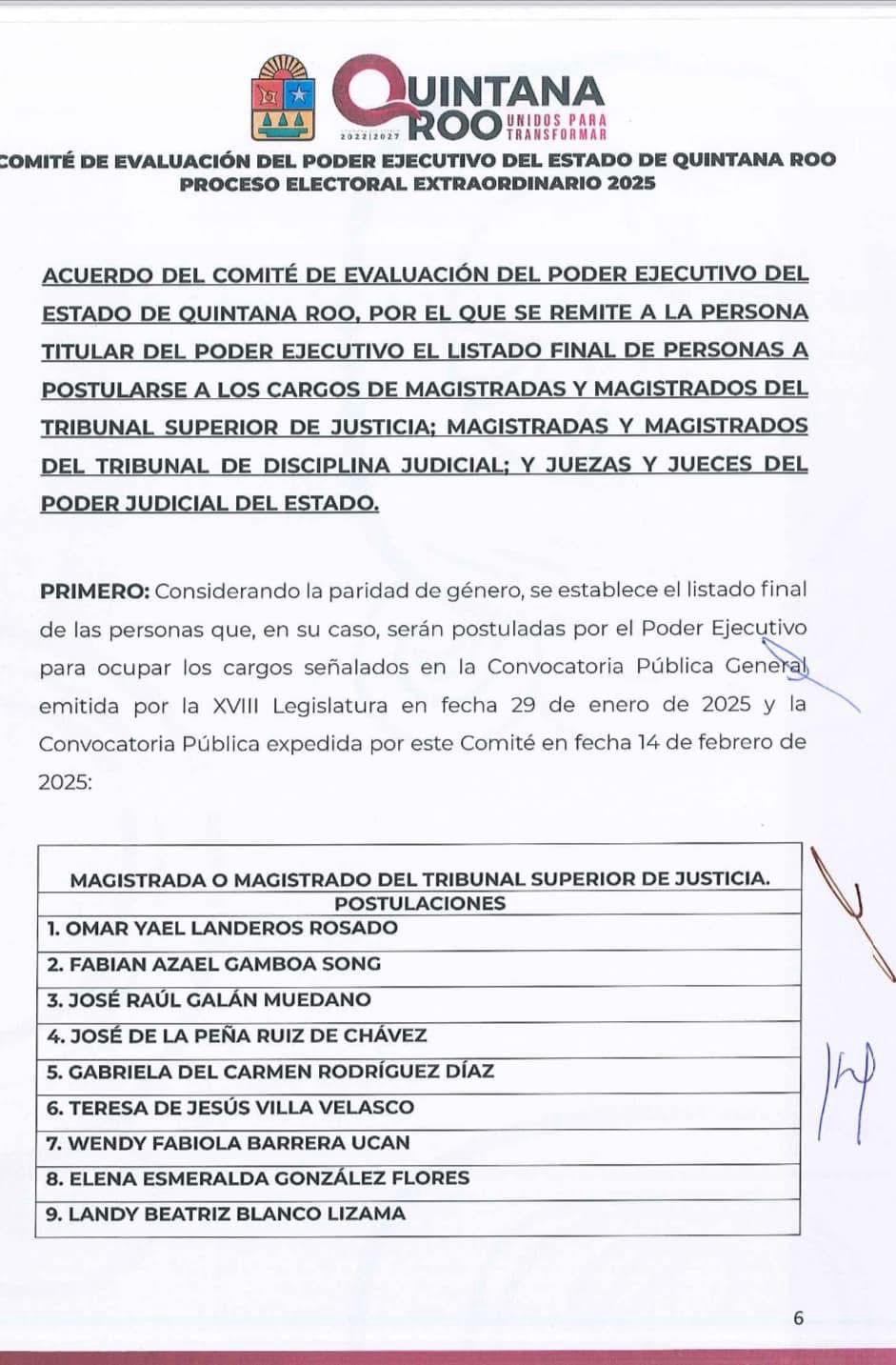 Sin embargo, la gobernadora Mara Lezama si lo incluyó entre los 9 candidatos a magistrados y magistradas del Tribunal Superior de Justicia que presentó a partir de la lista de aspirantes que le puso a disposición su comité de evaluación.