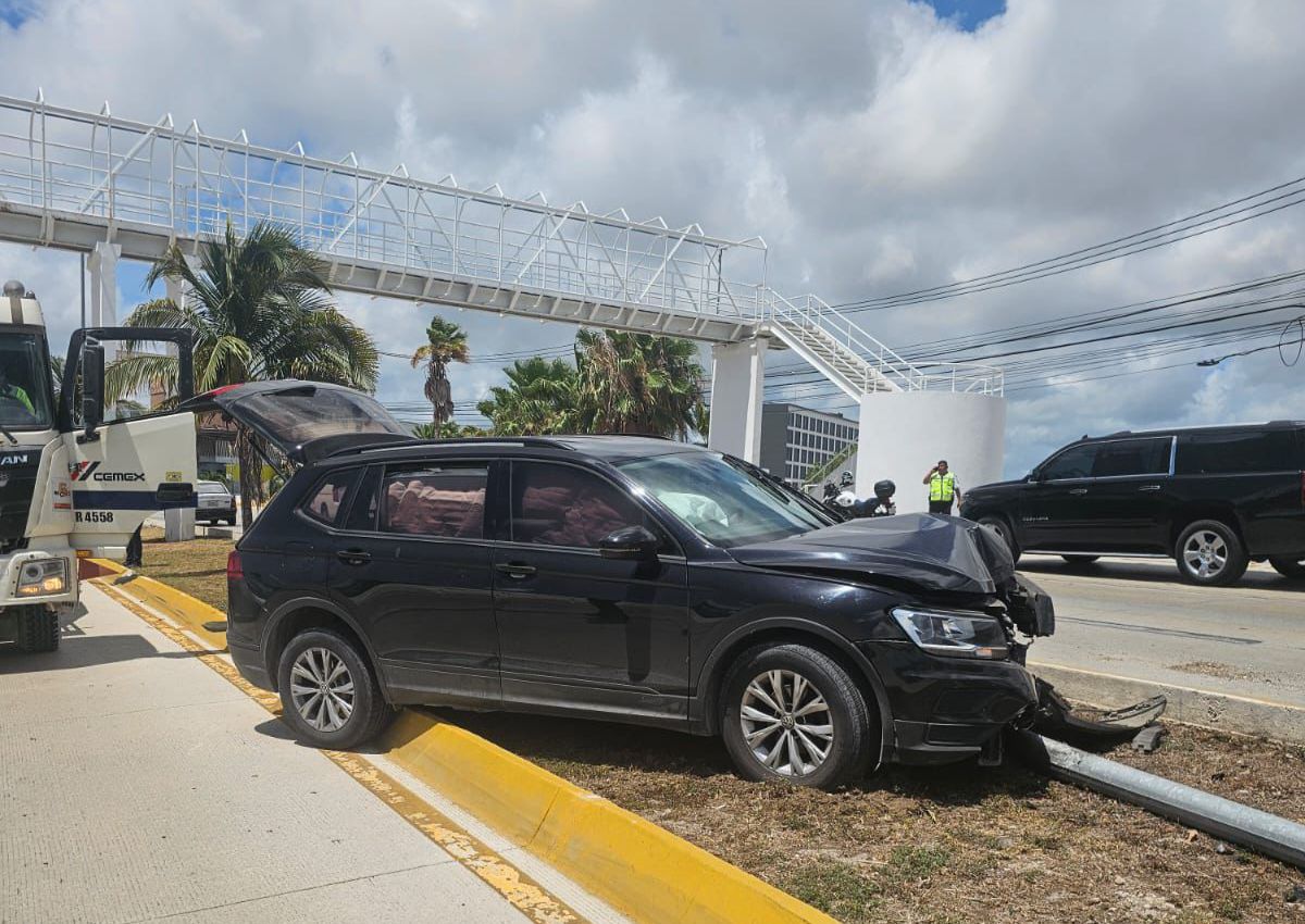 Cancún, 9 de mayo.— Un aparatoso accidente se registró la mañana de este viernes sobre el bulevar Colosio, a la altura de Plaza Cumbres, luego de que una camioneta perdiera el control y terminara impactándose contra un poste de alumbrado público.
