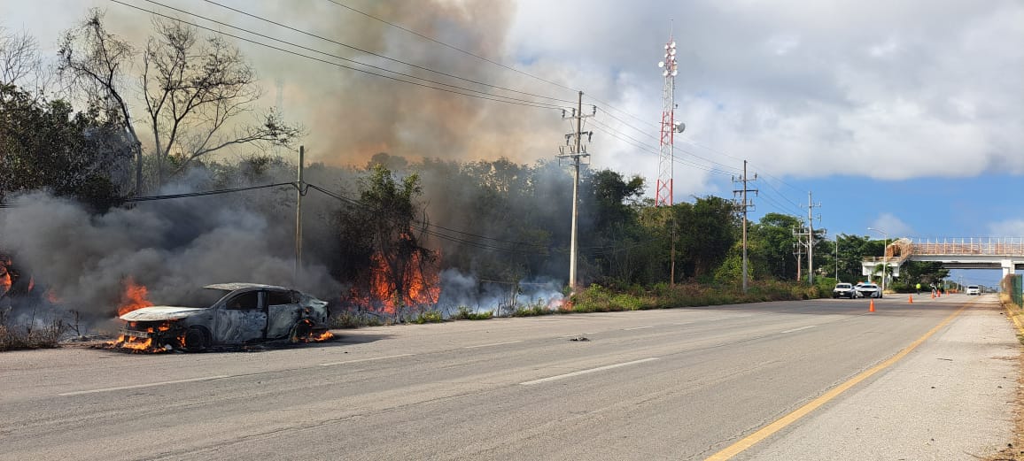TULUM a 01 de abril.– Un vehículo particular fue consumido por las llamas la tarde de este martes mientras circulaba sobre la carretera federal 307, a la altura del puente de Chemuyil en dirección hacia Tulum. El incidente generó momentos de tensión entre los automovilistas que transitaban por la zona y provocó un fuerte congestionamiento vial.