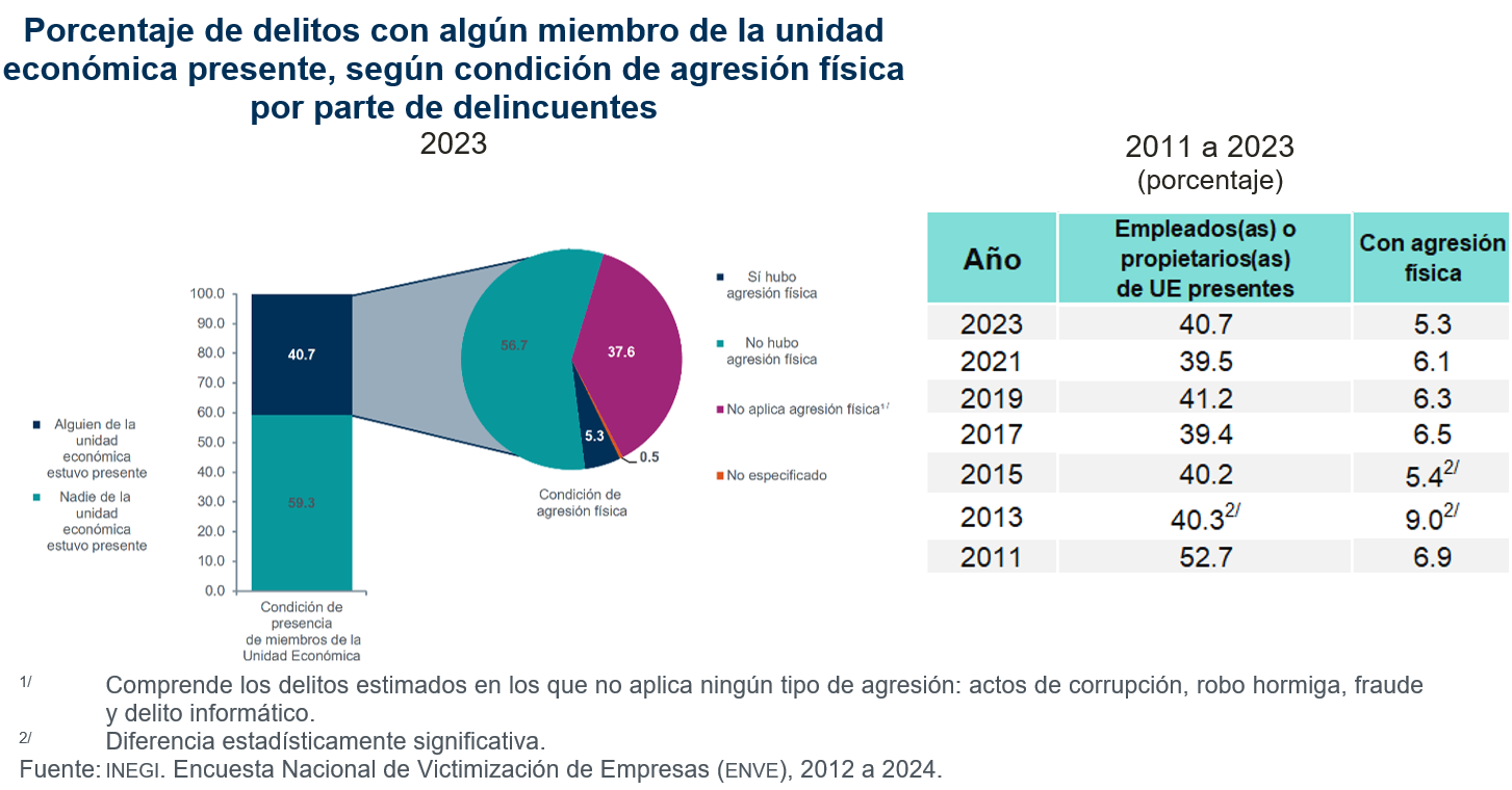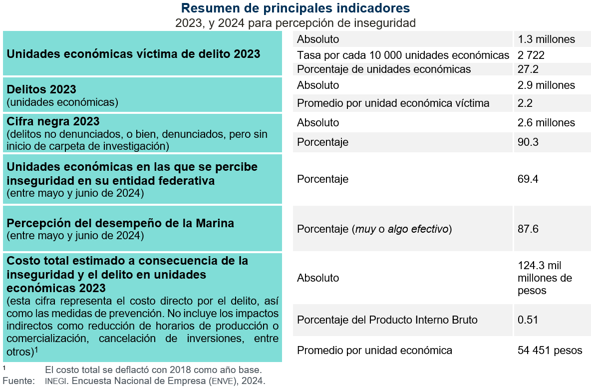 La Encuesta Nacional de Victimización de Empresas (ENVE) del INEGI estima que, en 2023, el costo total a consecuencia de la inseguridad y el delito en unidades económicas del sector privado representó un monto de 124.3 mil millones de pesos (0.51 por ciento del PIB).