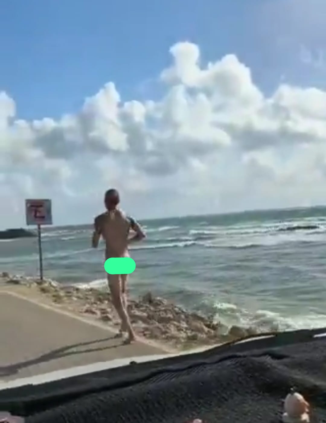 TULUM a 30 de marzo.- Completamente desnudo fue videograbado un ciudadano extranjero de unos 40 años aproximadamente mientras corría a la orilla de la carretera en la zona costera de este municipio.