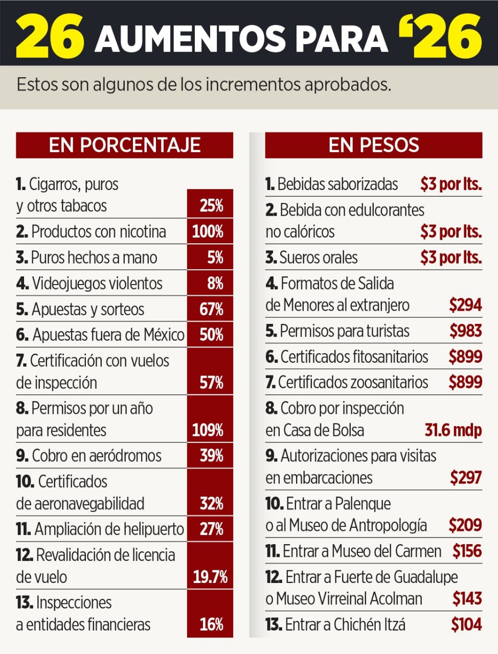 CIUDAD DE MÉXICO, 16 de octubre.- Una inusitada ola de impuestos y tarifas federales fue aprobada por la mayoría oficial de la 4T ayer en la Cámara de Diputados al avalar sin cambios la reforma a la Ley Federal de Derechos, que se suma a otros gravámenes especiales a artículos de consumo popular que entrarán en vigencia en 2026, de confirmarse por el Senado.