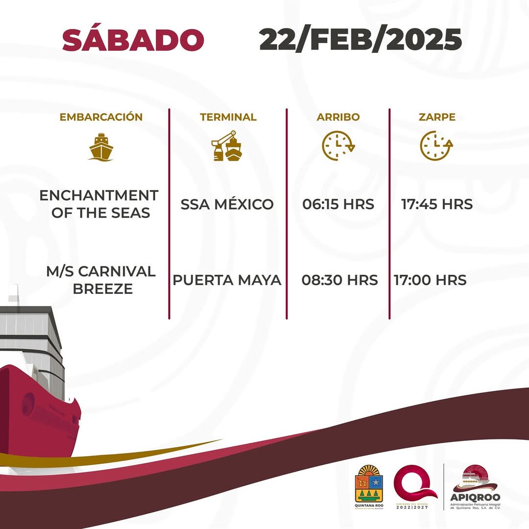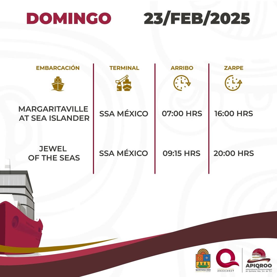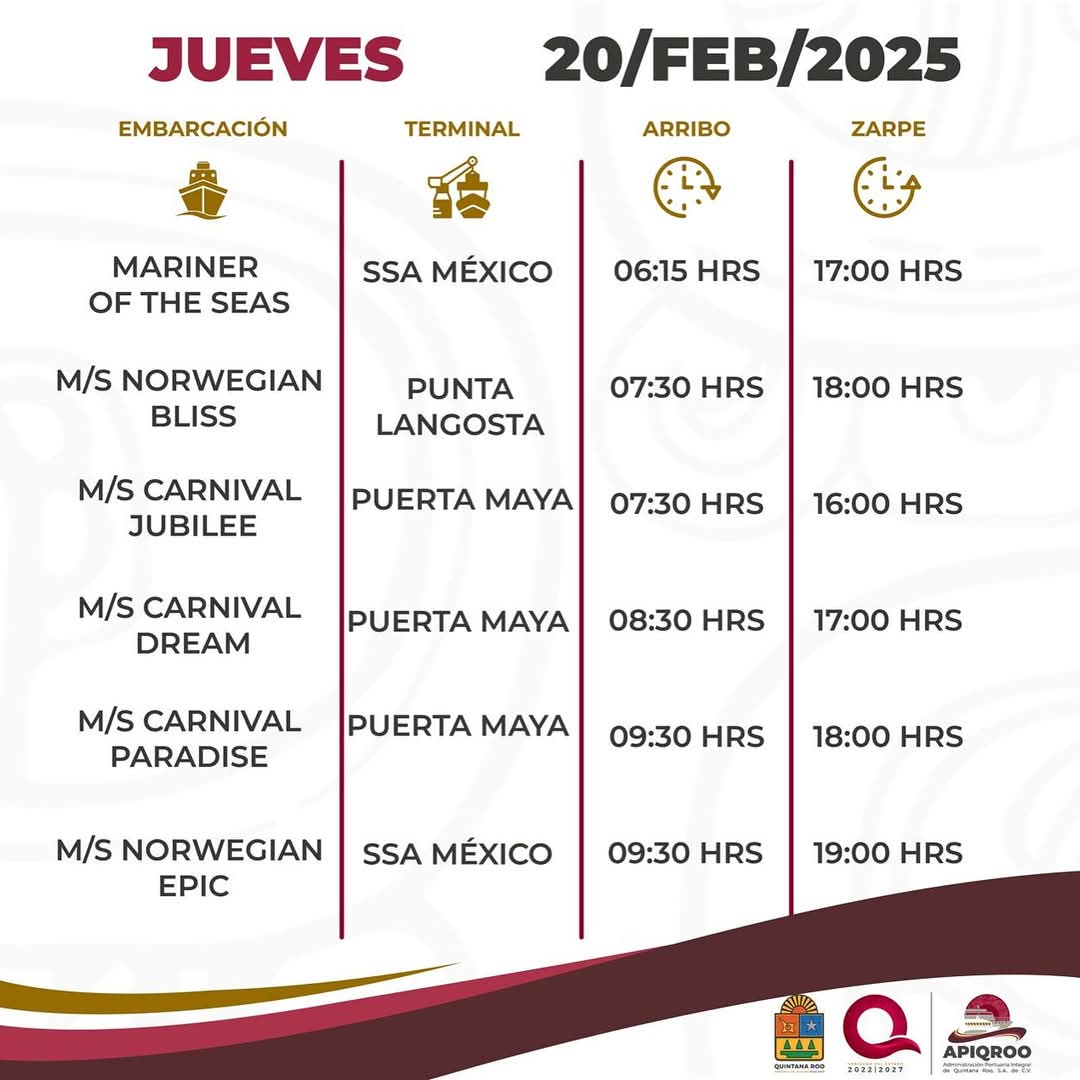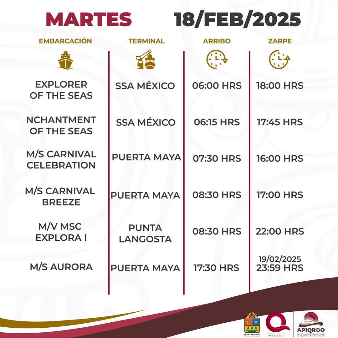 En esta ocasión, el muelle SSA será el que registrará mayor actividad con 13 atraques y seis casas llenas, seguido por su vecino Puerta Maya con 12 y dos casas llenas. Asimismo, en el céntrico Punta Langosta estarán llegando siete hoteles flotantes, con dos casas llenas, además de que un crucero se mantendrá al pairo.