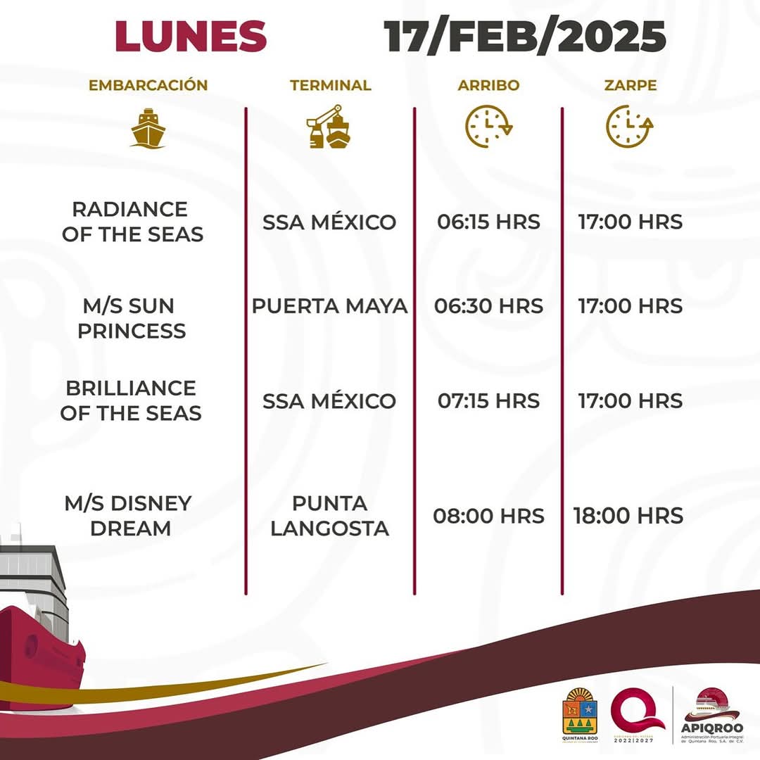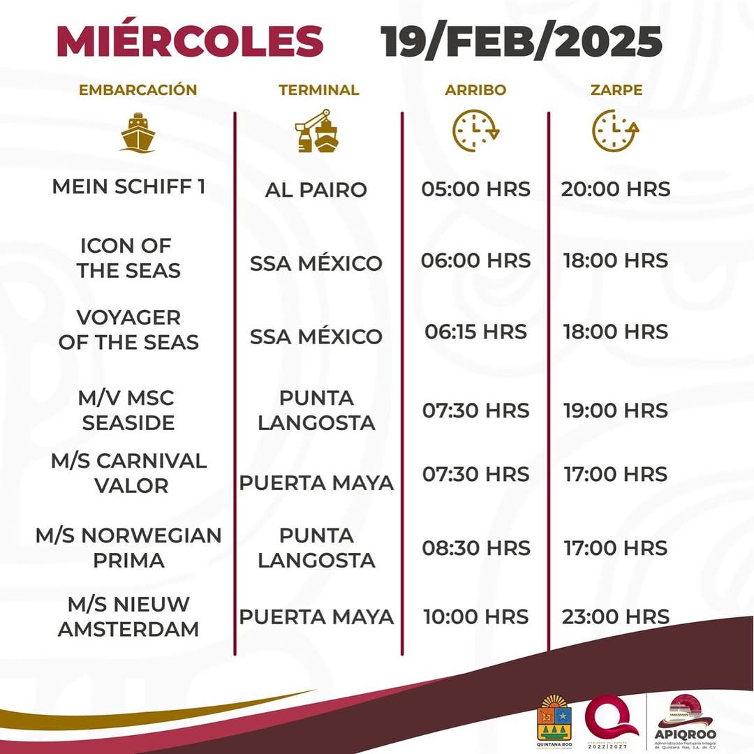 En esta ocasión, el muelle SSA será el que registrará mayor actividad con 13 atraques y seis casas llenas, seguido por su vecino Puerta Maya con 12 y dos casas llenas. Asimismo, en el céntrico Punta Langosta estarán llegando siete hoteles flotantes, con dos casas llenas, además de que un crucero se mantendrá al pairo.