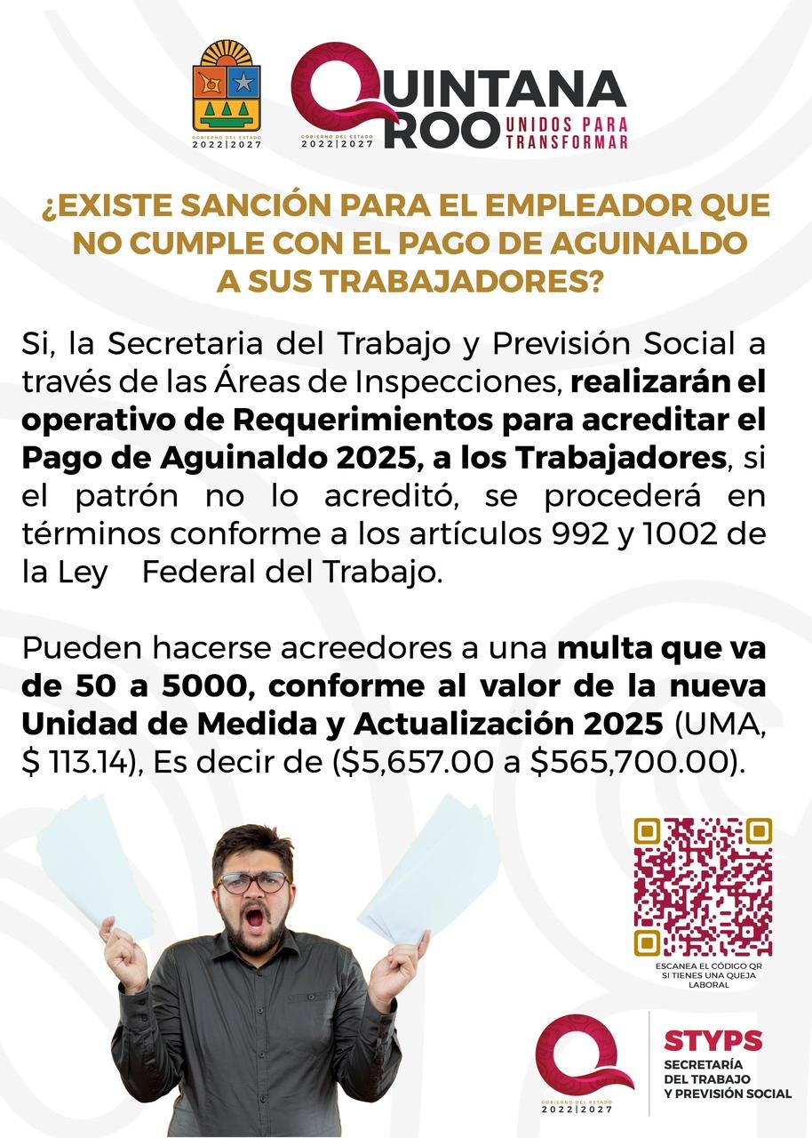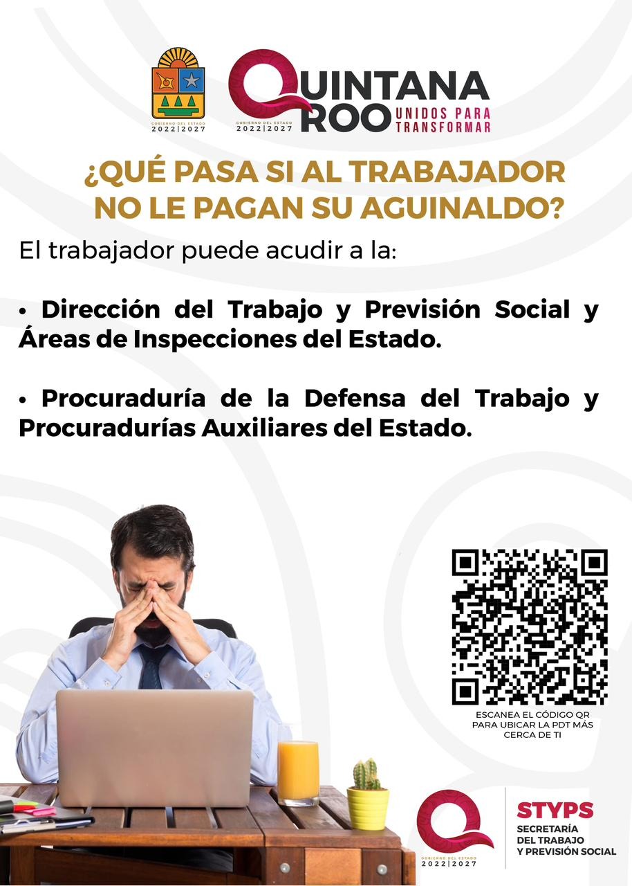 En caso de que un patrón no realice el pago del aguinaldo, las y los trabajadores podrán acudir a la Procuraduría de la Defensa del Trabajo para presentar su queja y solicitar conciliación laboral, o registrar denuncias anónimas en la Dirección del Trabajo y Previsión Social, de manera presencial o a través del correo electrónico trabajo@stypsqroo.gob.mx, lo que permitirá programar inspecciones extraordinarias para verificar el cumplimiento en los centros laborales.