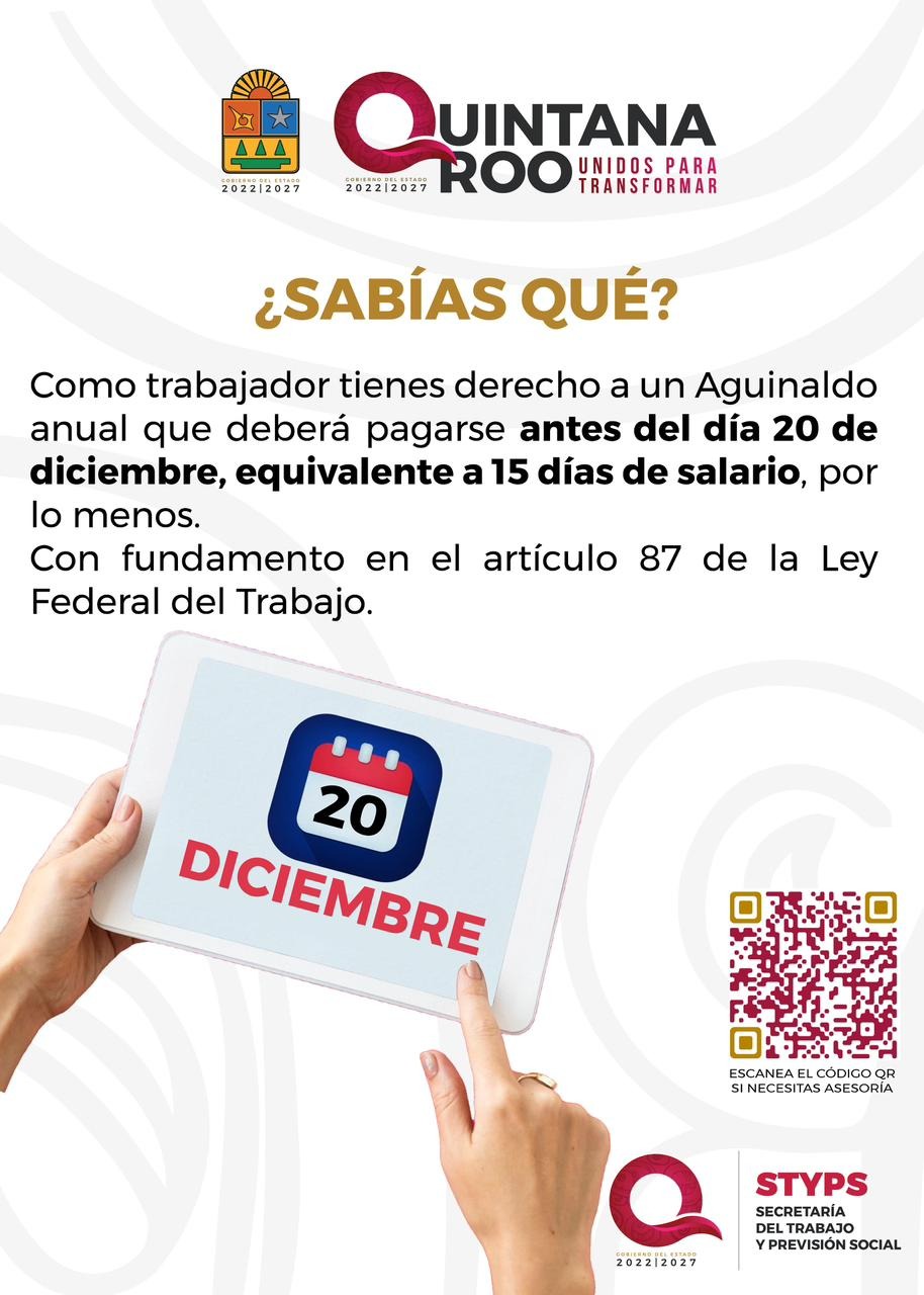 Chetumal.- La Secretaría del Trabajo y Previsión Social (STyPS) en cumplimiento de las políticas de justicia laboral impulsadas por el gobierno de humanista que encabeza la gobernadora Mara Lezama Espinosa, informó a que durante el presente mes de diciembre se puso en marcha el Operativo de Vigilancia del Pago de Aguinaldo 2025, a partir del 20 de diciembre en todo el estado, informó la encargada del despacho de la STyPS Verónica Salinas Mozo.