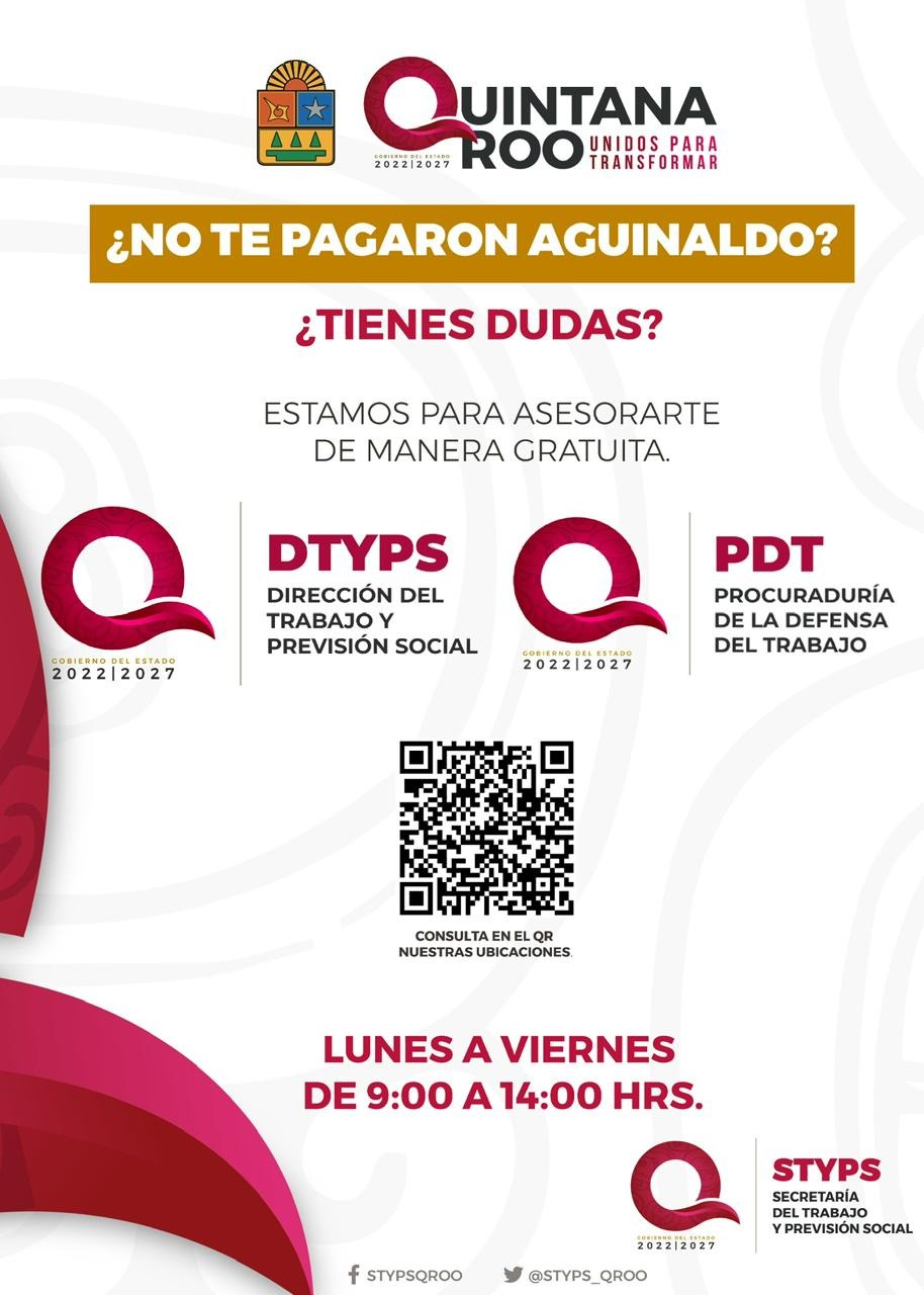 En caso de que un patrón no realice el pago del aguinaldo, las y los trabajadores podrán acudir a la Procuraduría de la Defensa del Trabajo para presentar su queja y solicitar conciliación laboral, o registrar denuncias anónimas en la Dirección del Trabajo y Previsión Social, de manera presencial o a través del correo electrónico trabajo@stypsqroo.gob.mx, lo que permitirá programar inspecciones extraordinarias para verificar el cumplimiento en los centros laborales.
