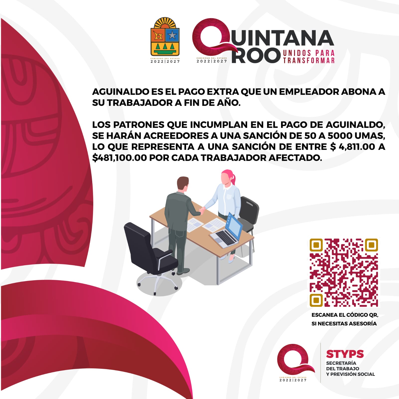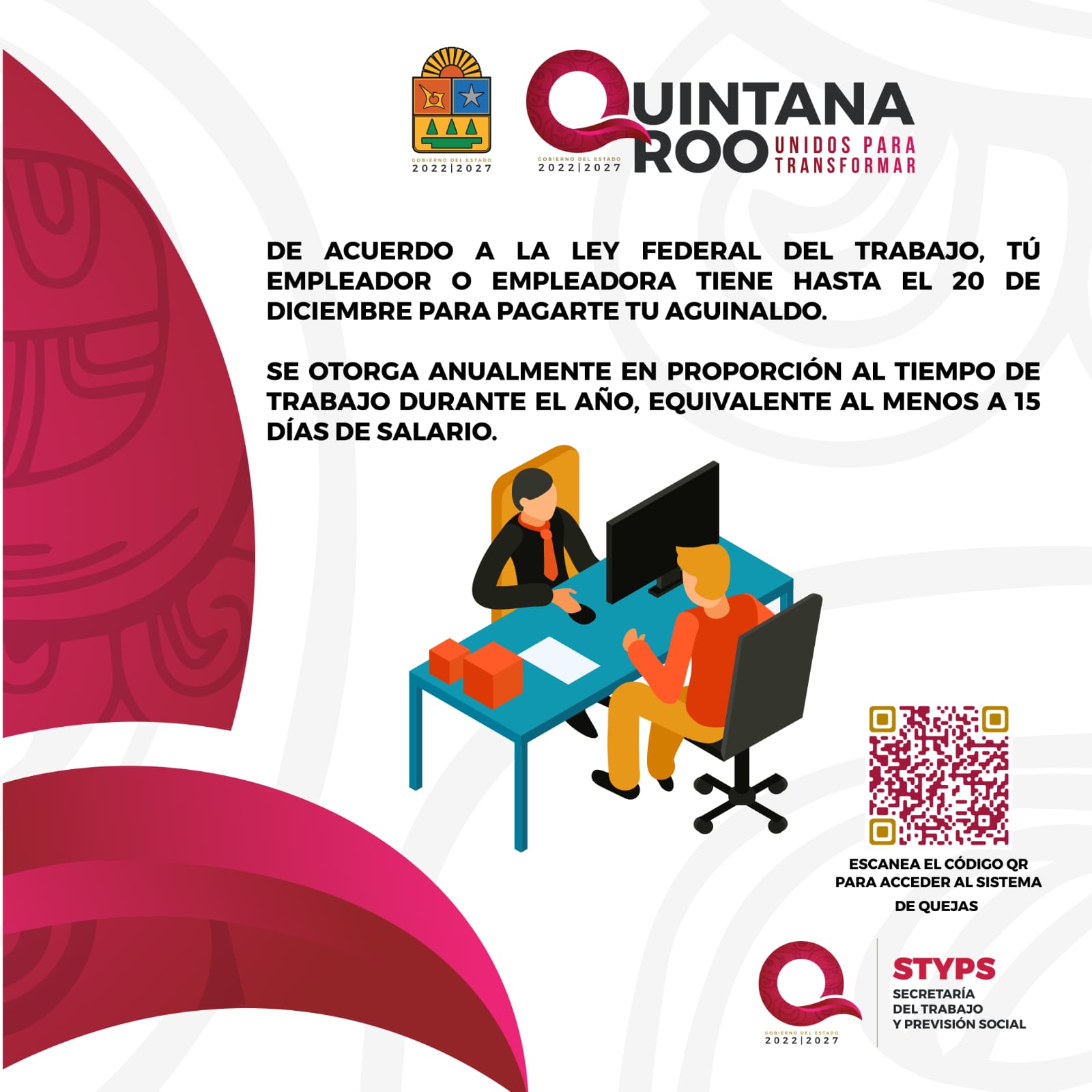 Chetumal.- La Secretaría del Trabajo y Previsión Social del Estado (STyPS) supervisará a través del operativo de verificación “Pago de Aguinaldo 2024” que las y los patrones cumplan con esta prestación para sus trabajadores, por lo que implementaron asesorías gratuitas y permanentes durante la temporada vacacional.