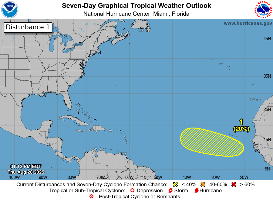 Este jueves al mediodía la perturbación atmosférica fue valorada con 0 % de probabilidad para desarrollar un ciclón en un período de 48 horas y de 20 % para un lapso de 7 días.
