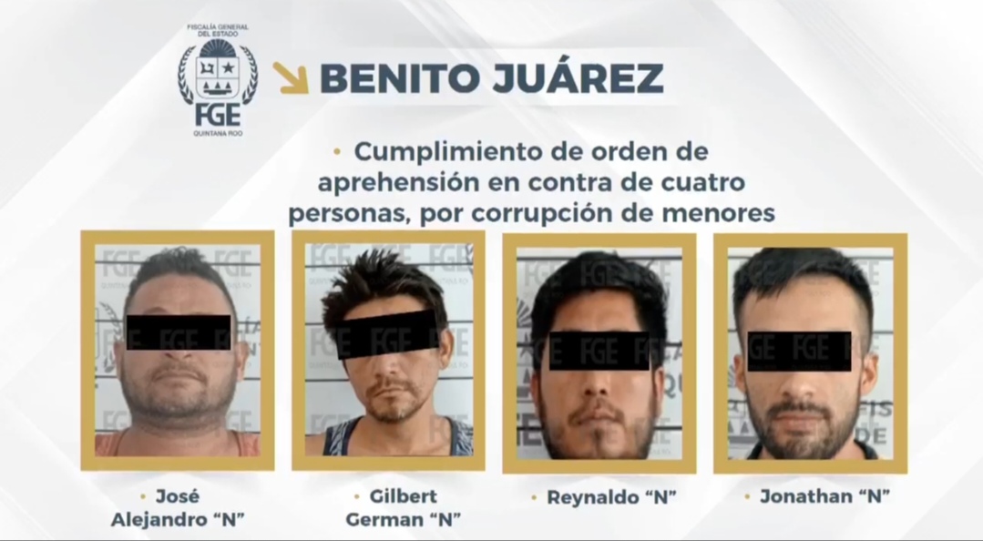 Los detenidos fueron identificados como José Alejandro “N”, Gilbert Germán “N”, Reynaldo “N” y Jonathan “N”, quienes, según las investigaciones de la Fiscalía General del Estado, participaron en al menos dos encuentros con la menor los días 8 y 9 de junio del presente año.