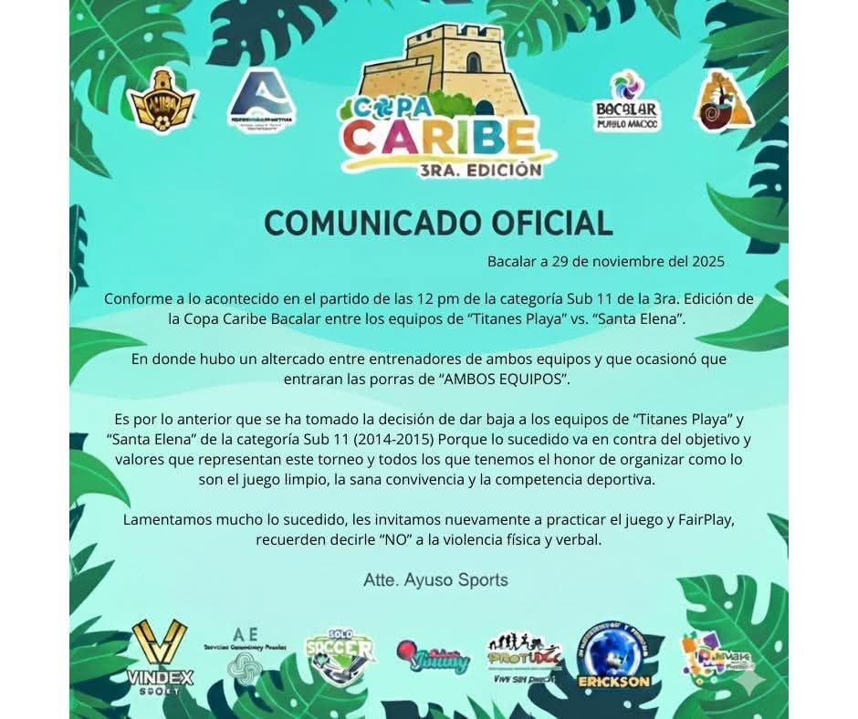 La empresa Ayuso Sports, responsable del evento —que reune a 98 equipos de distintas regiones—, emitió un comunicado oficial donde confirmó la baja inmediata de ambos equipos implicados debido a que los hechos contravinieron los principios del torneo de juego limpio, sana convivencia y competencia deportiva.