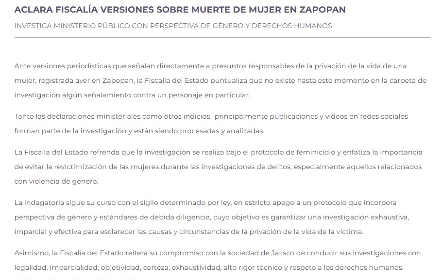 Ante versiones que señalan a presuntos responsables del feminicidio ocurrido en Zapopan, aclaramos que no existe señalamiento directo contra ninguna persona en la carpeta de investigación. pic.twitter.com/KC2u3oj87l