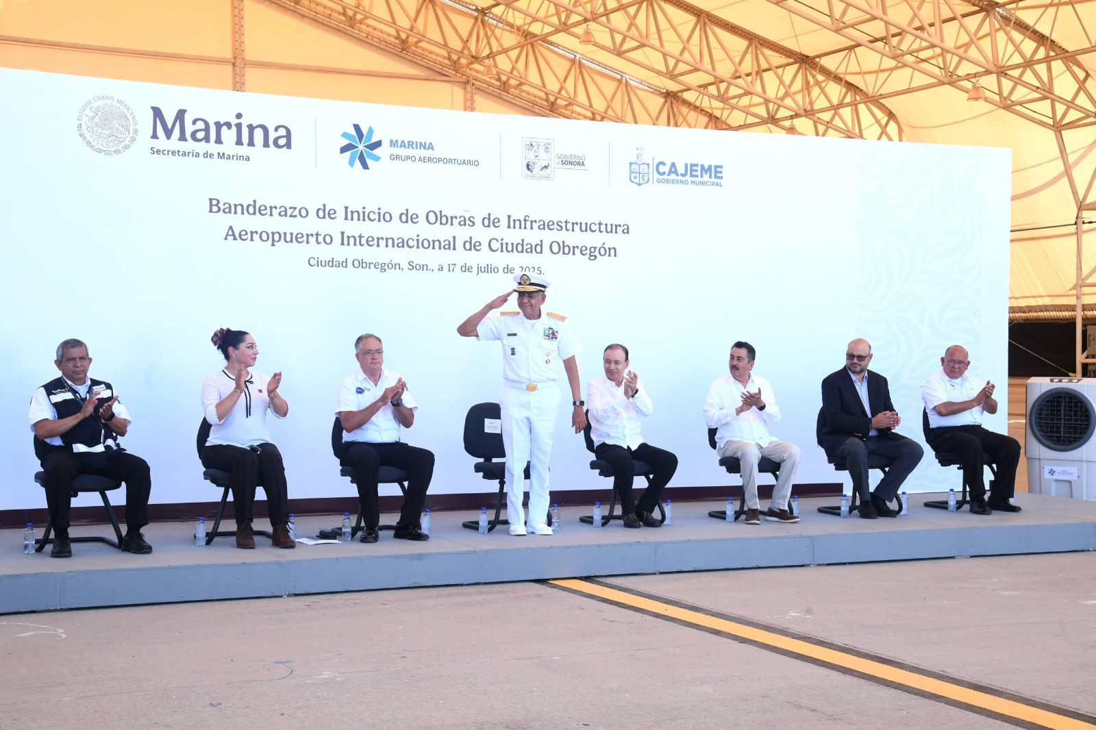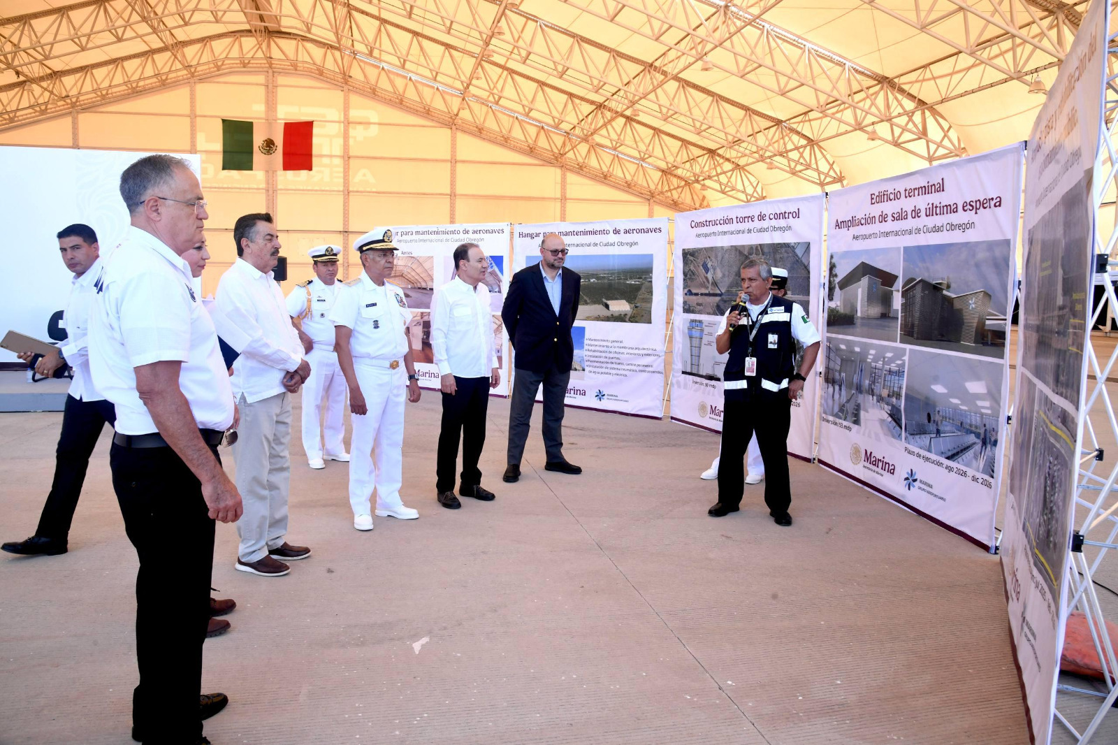 En seguimiento al Plan Maestro de Desarrollo del Aeropuerto Internacional de Ciudad Obregón, el Secretario de Marina, Almirante Raymundo Pedro Morales Ángeles; el Gobernador de Sonora, Dr. Francisco Alfonso Durazo Montaño, y el Director General de Grupo Aeroportuario Marina, Almirante Juan José Padilla Olmos, dieron el banderazo de inicio de obras de la ampliación de pista y rehabilitación del estacionamiento público de dicha terminal aérea.