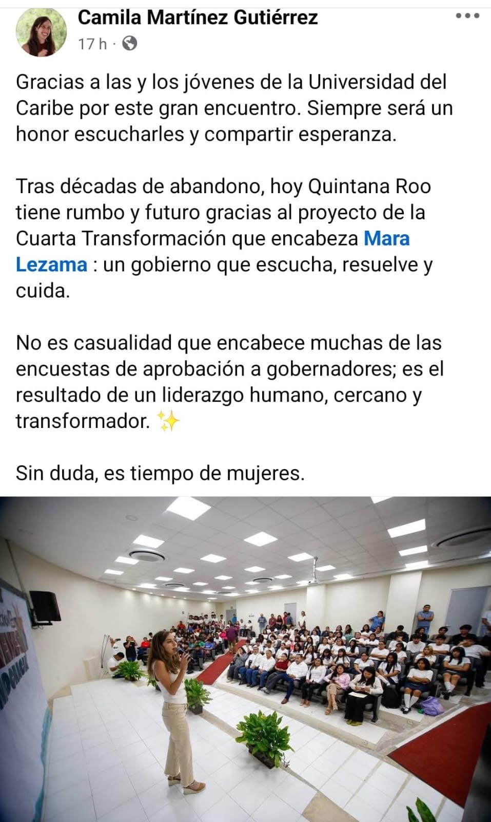 “Gracias a las y los jóvenes de la Universidad del Caribe por este gran encuentro. Siempre será un honor escucharles y compartir esperanza”, escribió la morenista en su cuenta de Facebook.