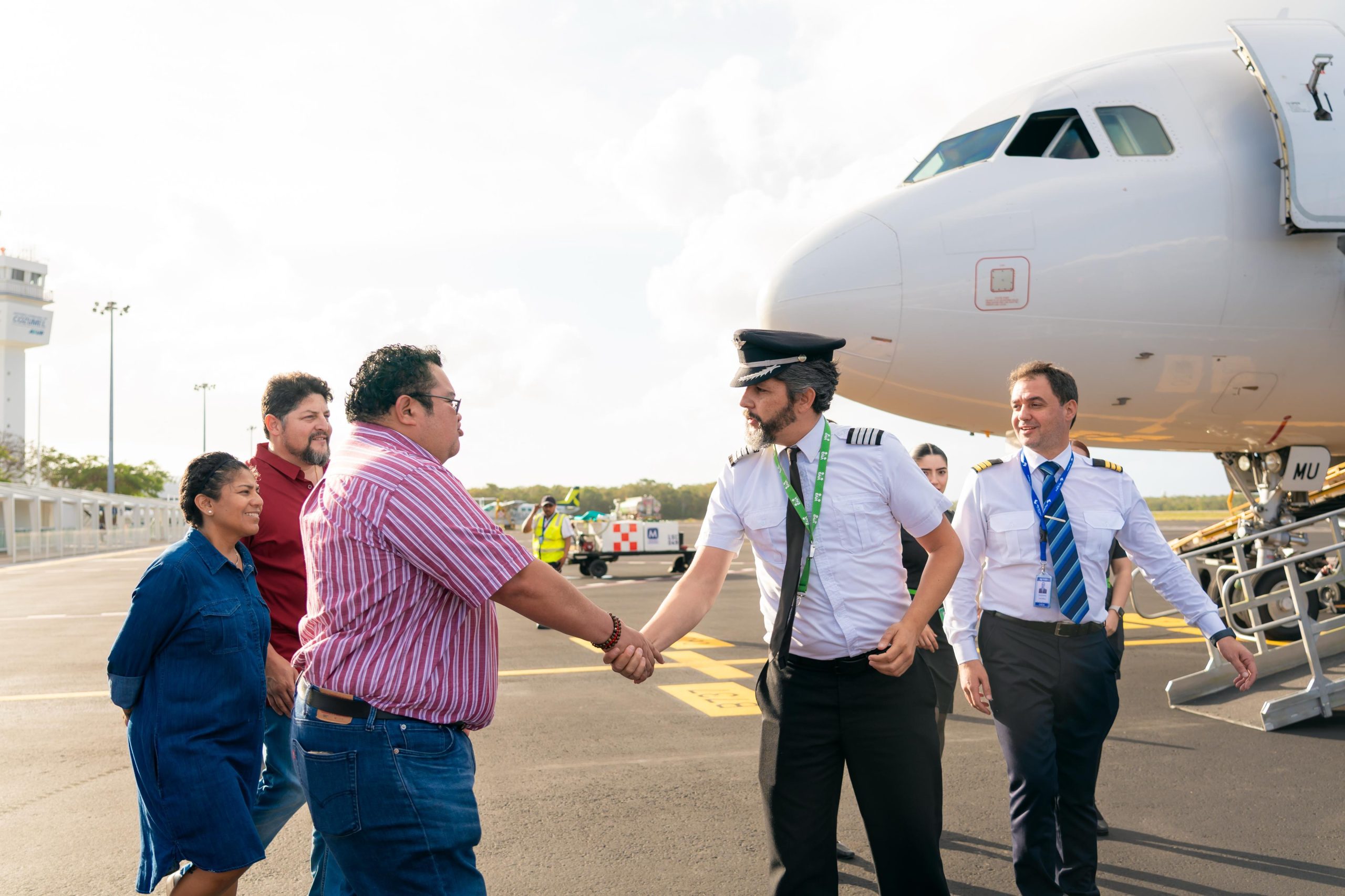 Acompañado por su esposa, la presidenta honoraria del Sistema DIF Cozumel, Diana Sosa Blanco, recibió a los primeros dos visitantes procedentes de la sultana del norte que descendieron de la aeronave con capacidad para 160 pasajeros.