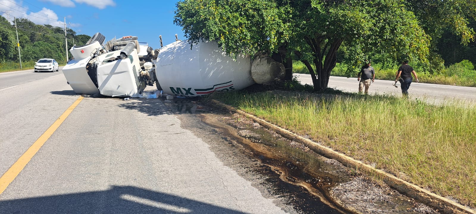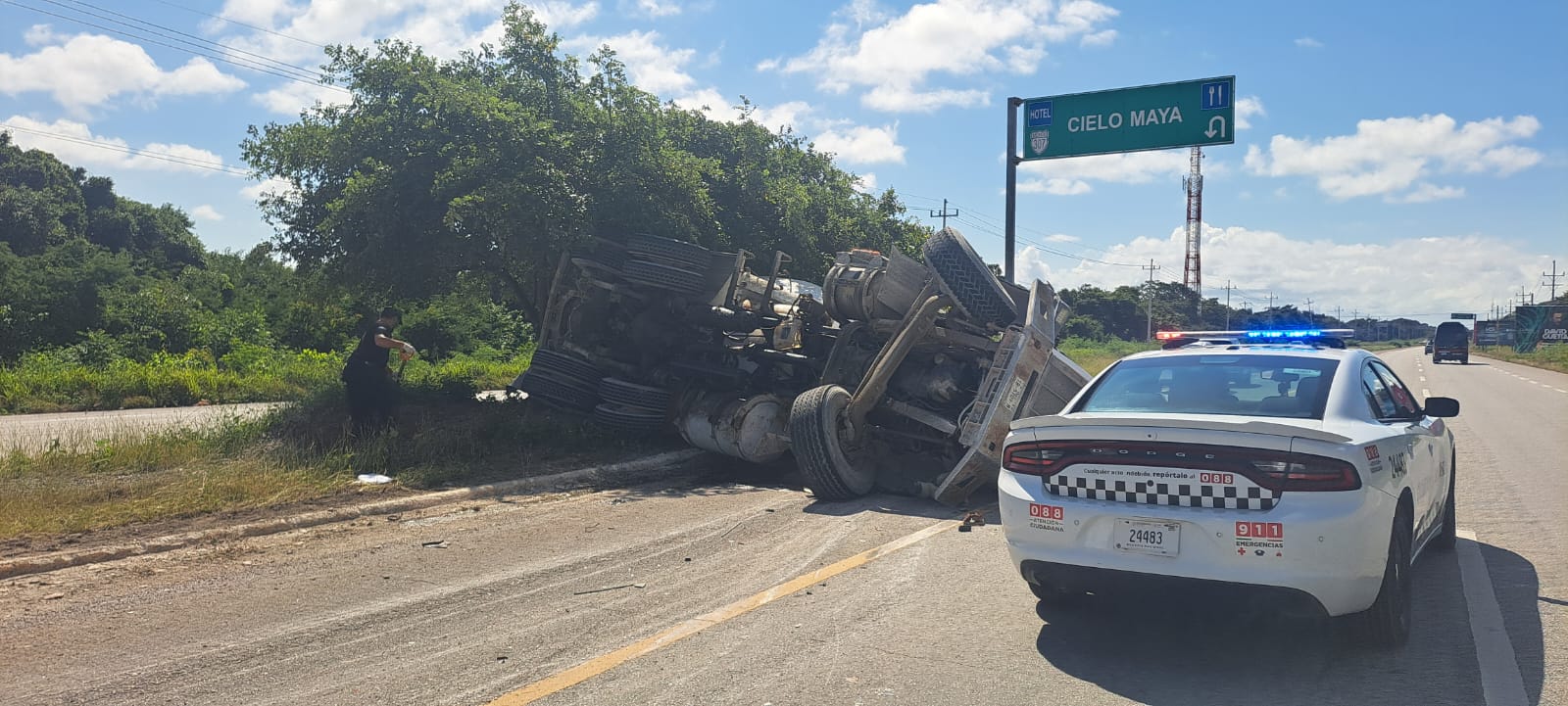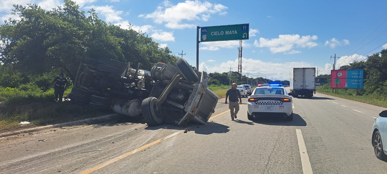 El peso de la carga y la inercia del vehículo derivaron en la volcadura del camión sobre la cinta asfáltica, en un punto ubicado aproximadamente a cinco kilómetros antes de la cabecera municipal de Tulum. A pesar de lo aparatoso del percance, el chofer resultó ileso y no fue necesario su traslado a un hospital.