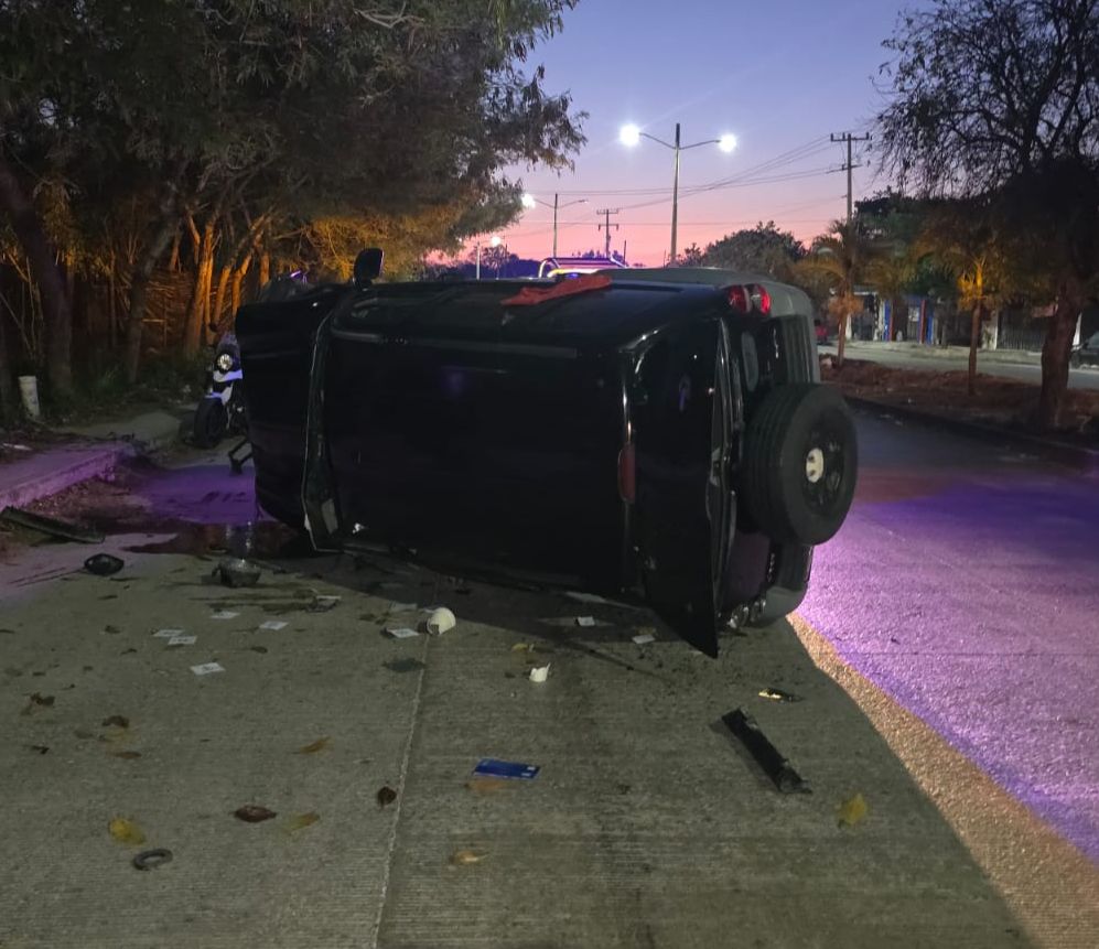 CANCÚN, QRoo, 26 de marzo de 2025.- La madrugada de este miércoles, la tranquilidad de la avenida Leona Vicario fue interrumpida por un aparatoso accidente que pudo haber terminado en tragedia. Un Jeep Liberty de color negro se volcó violentamente tras chocar contra un árbol, dejando una escena de caos y misterio, pues el conductor desapareció sin dejar rastro.