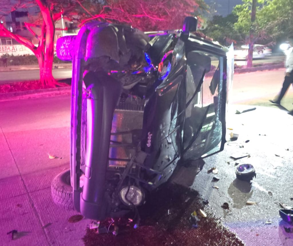 CANCÚN, QRoo, 26 de marzo de 2025.- La madrugada de este miércoles, la tranquilidad de la avenida Leona Vicario fue interrumpida por un aparatoso accidente que pudo haber terminado en tragedia. Un Jeep Liberty de color negro se volcó violentamente tras chocar contra un árbol, dejando una escena de caos y misterio, pues el conductor desapareció sin dejar rastro.