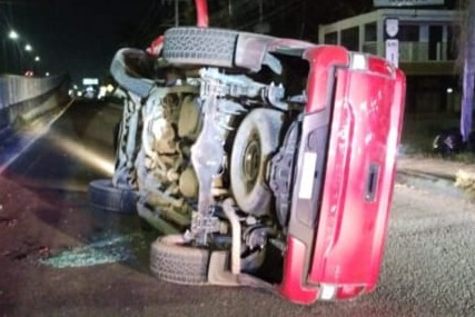 El accidente se registró en el kilómetro 11, cuando los ocupantes de una camioneta roja transitaban por la vía y, al tomar con exceso de velocidad la lateral del puente, el conductor perdió el control y chocó contra el muro de contención.
