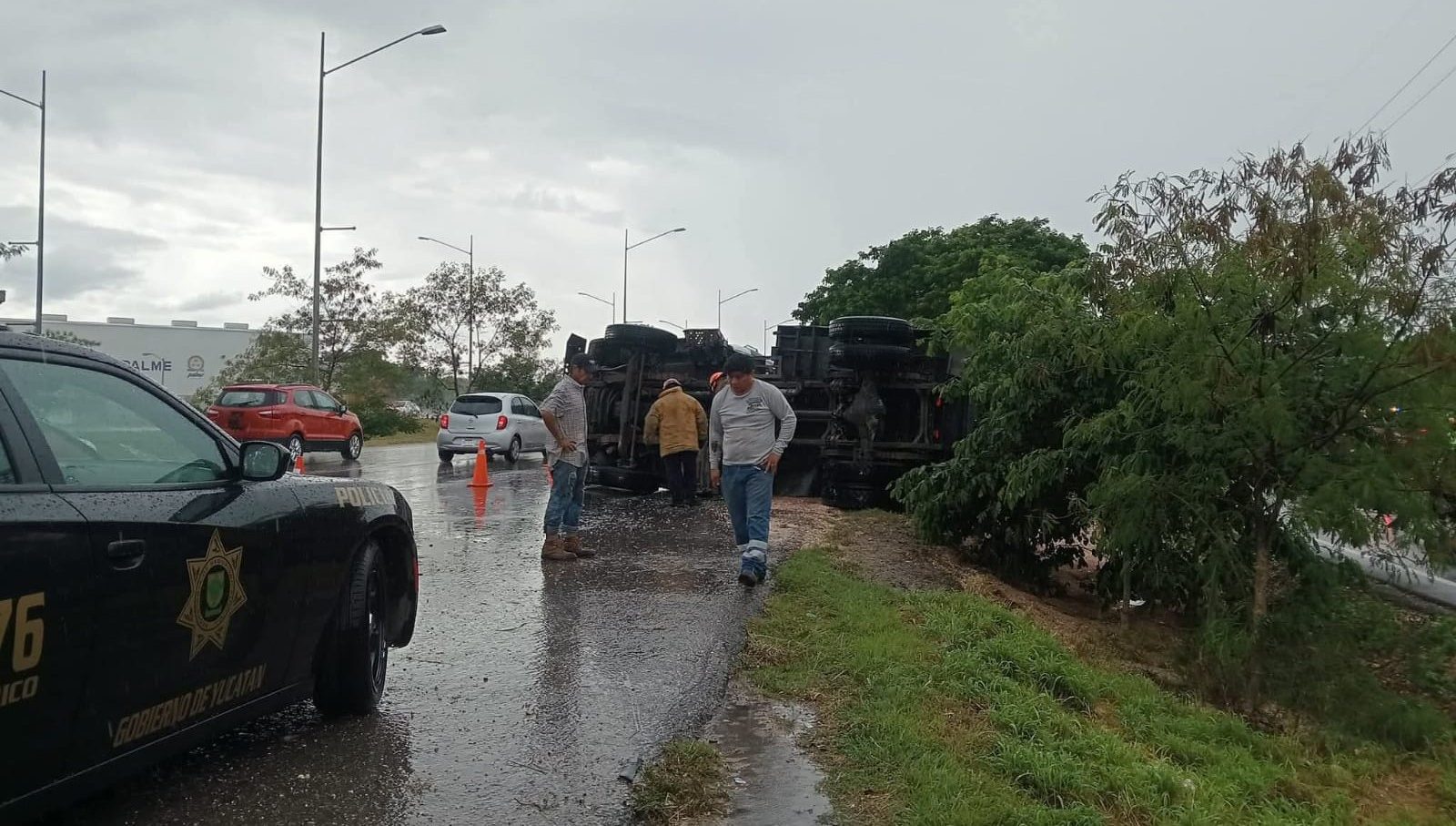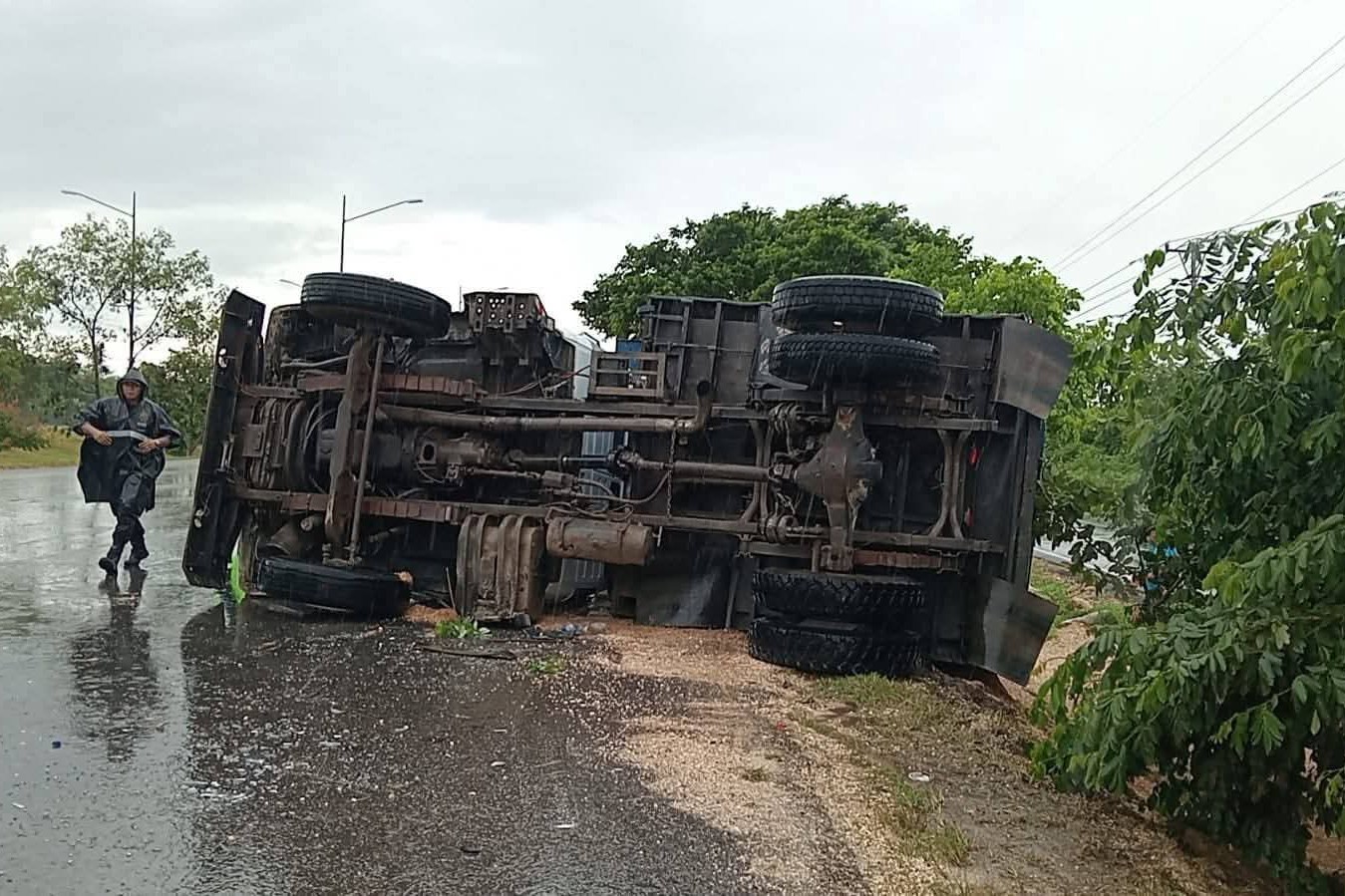 Esta tarde caía una fuerte lluvia por esa zona del Periférico. Por ahí avanzaba la pesada unidad, cuyo operador de pronto perdió el control del volante, el vehículo patinó en el asfalto y finalmente volcó de costado derecho, tirando gran parte de su carga.