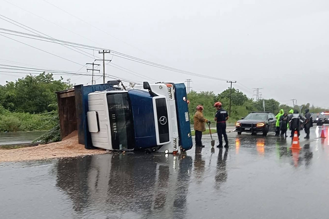 Esta tarde caía una fuerte lluvia por esa zona del Periférico. Por ahí avanzaba la pesada unidad, cuyo operador de pronto perdió el control del volante, el vehículo patinó en el asfalto y finalmente volcó de costado derecho, tirando gran parte de su carga.