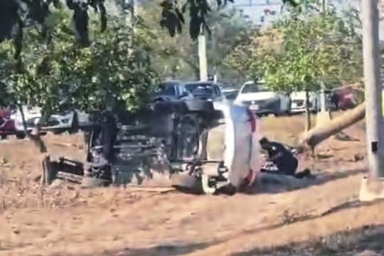 Vuelca Auto en el Periférico de Mérida Luego de Caer a una Hondonada y Estrellarse Contra un Árbol