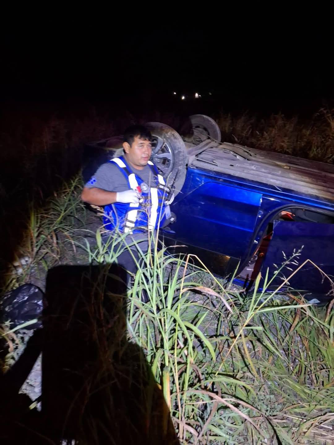 El accidente ocurrió a la altura del kilómetro 19, donde un automóvil Chevrolet de color azul, con placas del estado de Quintana Roo, perdió el control por razones que aún no han sido esclarecidas. La unidad salió del pavimento, avanzó varios metros entre el monte y terminó volcada tras impactarse contra formaciones rocosas.