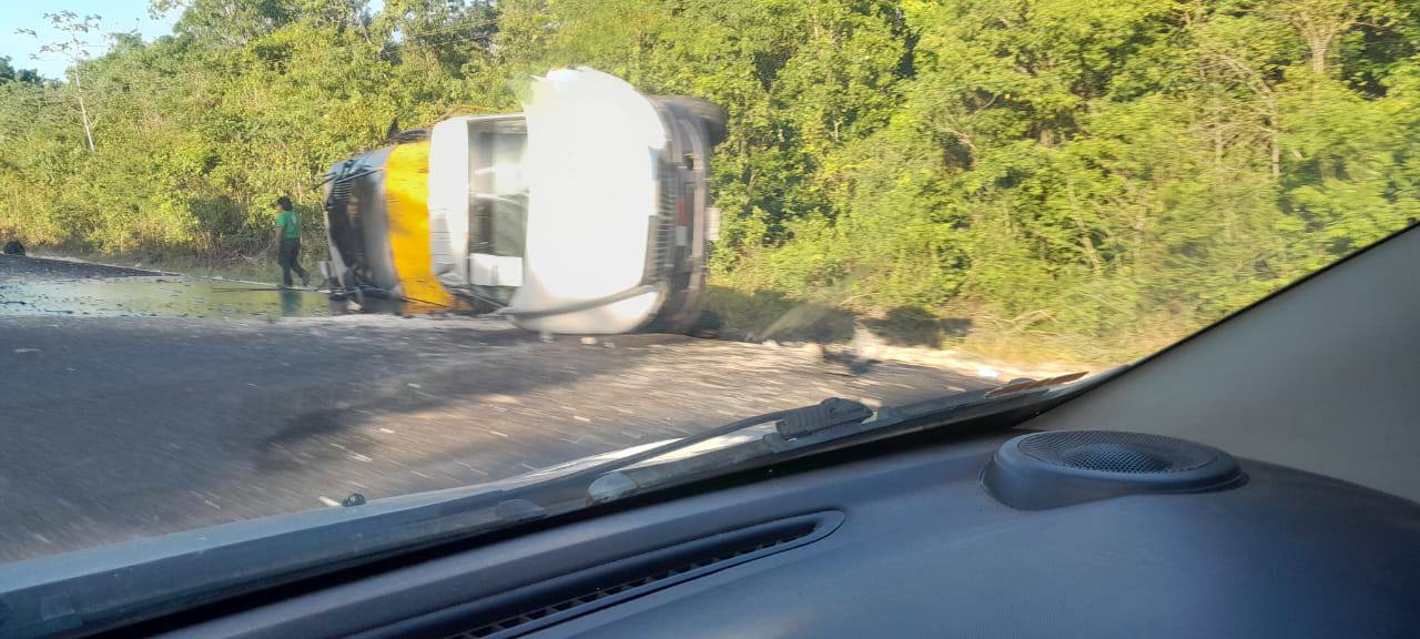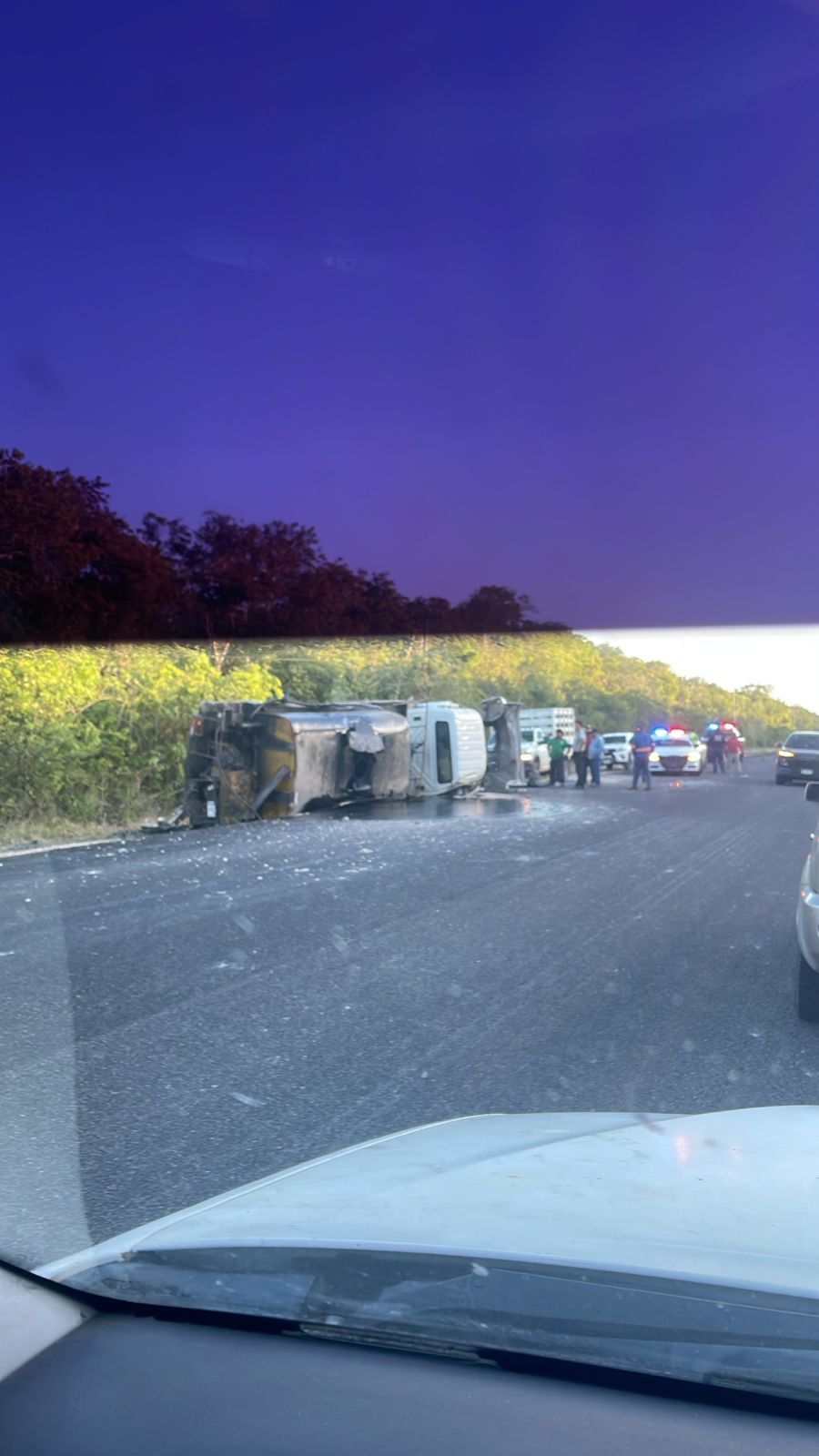 Una pipa volcó este sábado en el tramo Buenavista-Limones de la carretera Chetumal-Cancún, lo que ocasionó derrame de combustible y afectación parcial a la vialidad. El conductor resultó ileso