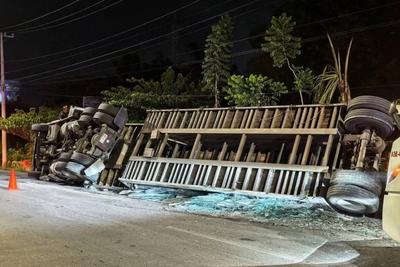 Por desgracia, las llantas derechas del tracto y el remolque “pellizcaron” el límite del asfalto, jalando el pesado vehículo y haciéndolo volcar de costado derecho en la maleza.