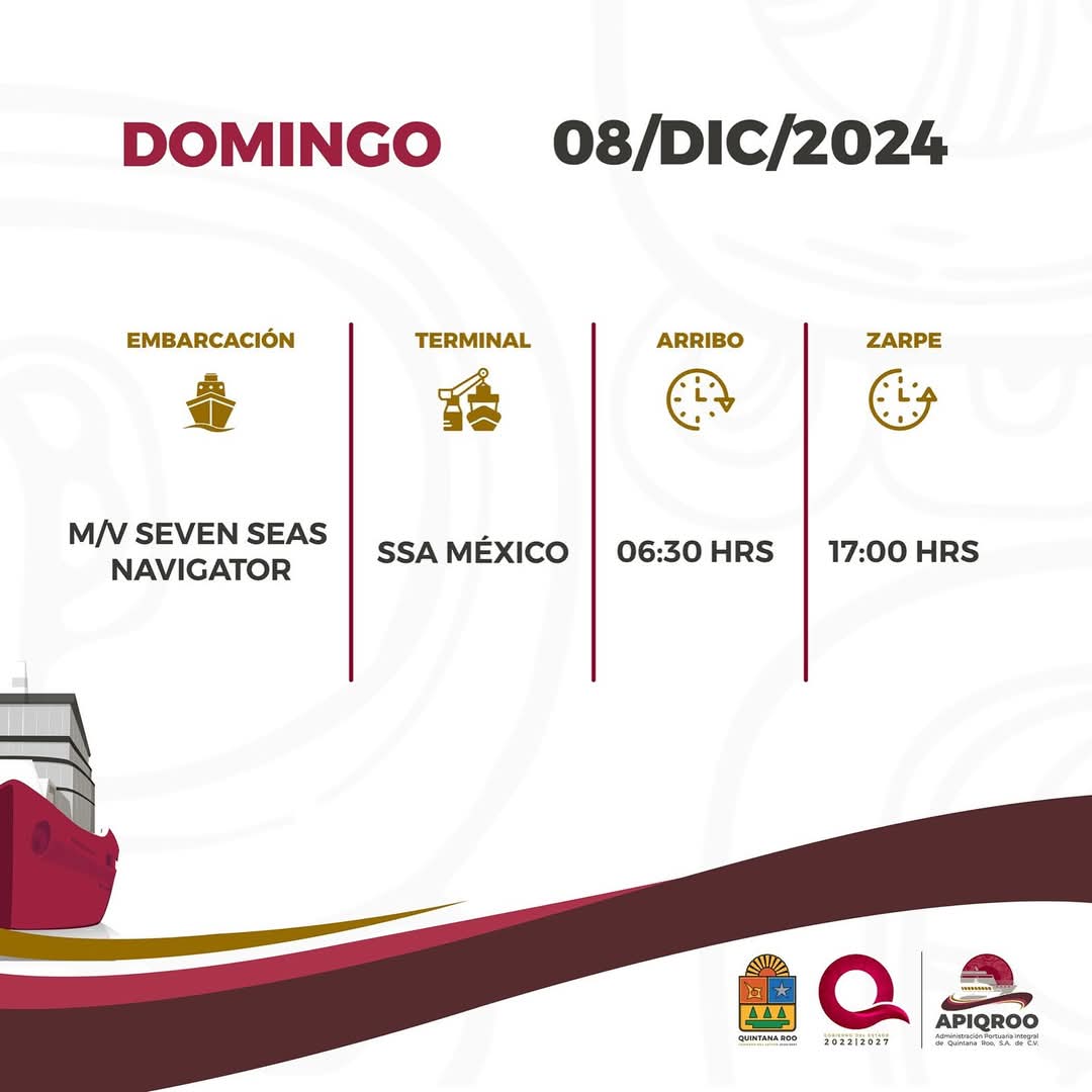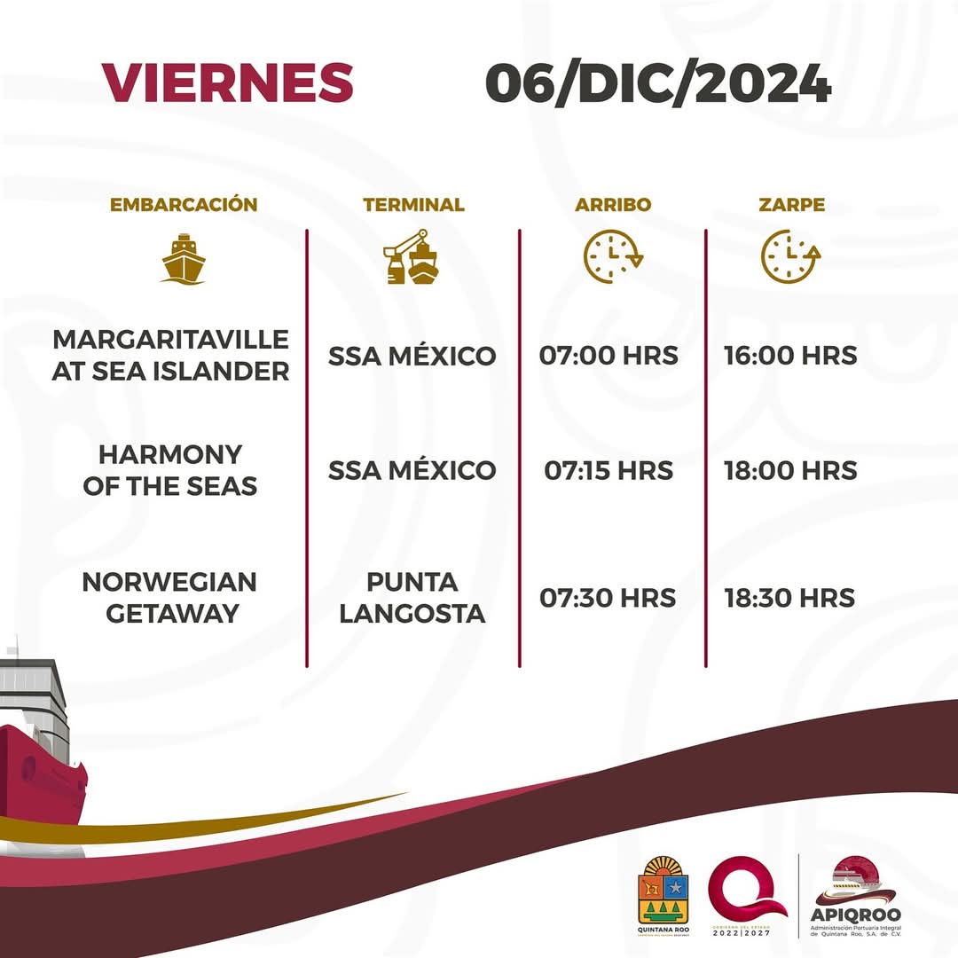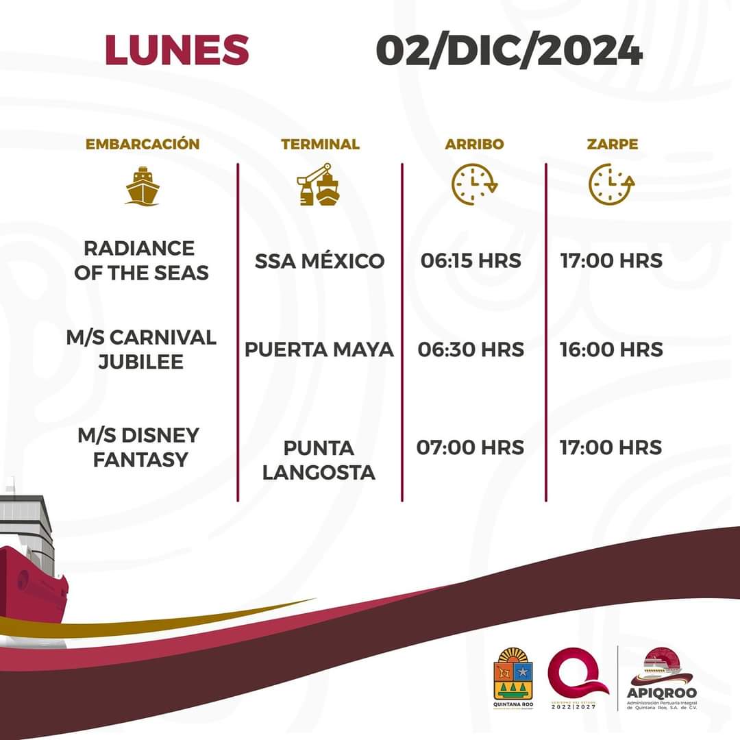 COZUMEL, Q. ROO, 30 de noviembre.-  Luego del notable repunte durante la semana que está por concluir la actividad portuaria de gran calado en Cozumel volverá a descender en el periodo que comprende entre el 2 y el 8 de diciembre,  cuando  recibirá 28 colosos de los mares (cuatro menos que esta semana) con alrededor de 84 mil turistas que estarán generando una derrama económica estimada en más de 114 millones de pesos.