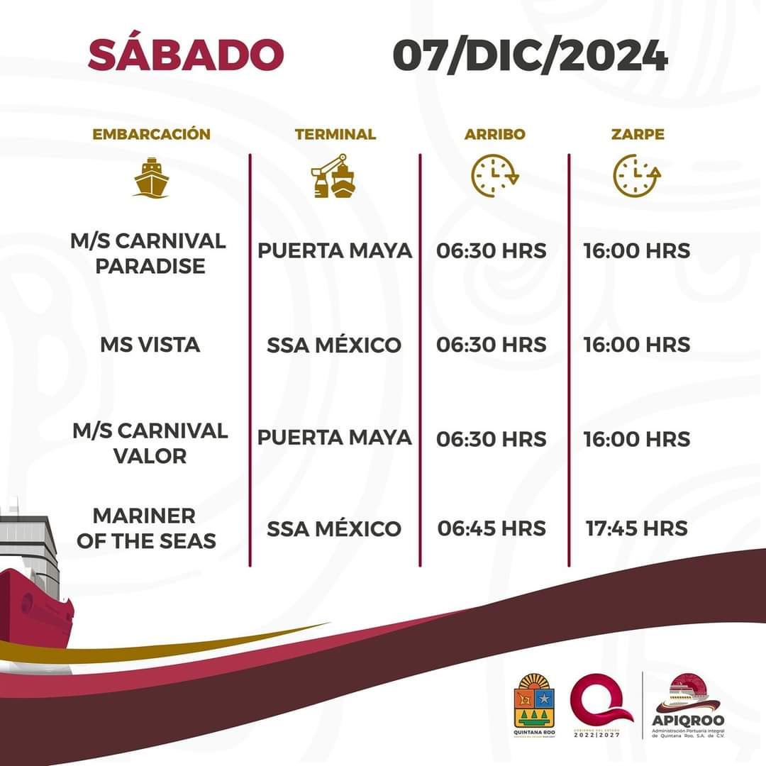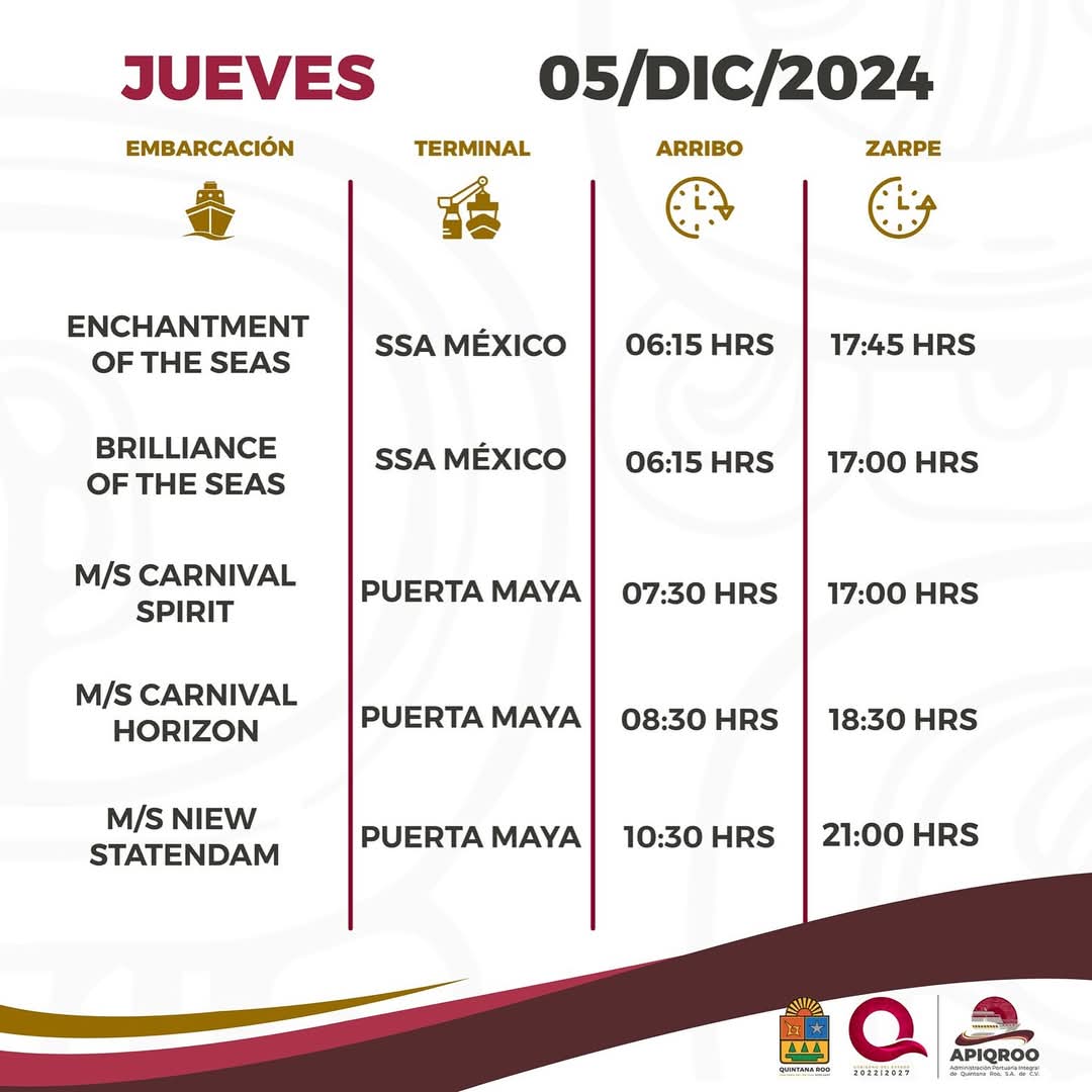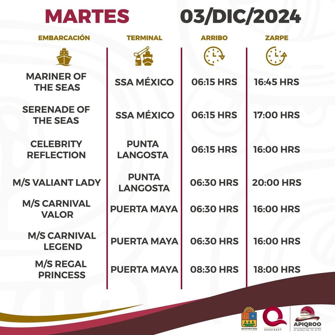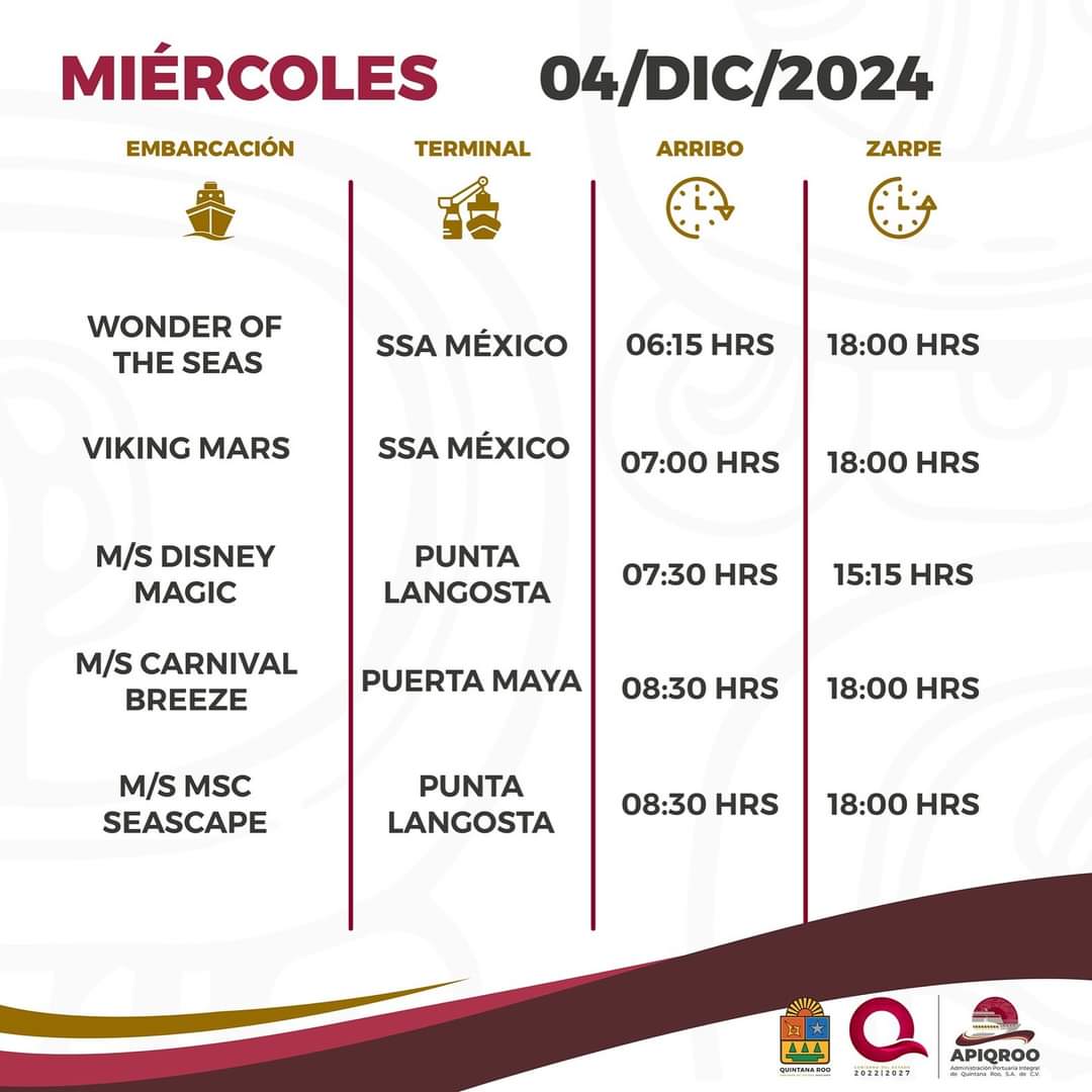 COZUMEL, Q. ROO, 30 de noviembre.-  Luego del notable repunte durante la semana que está por concluir la actividad portuaria de gran calado en Cozumel volverá a descender en el periodo que comprende entre el 2 y el 8 de diciembre,  cuando  recibirá 28 colosos de los mares (cuatro menos que esta semana) con alrededor de 84 mil turistas que estarán generando una derrama económica estimada en más de 114 millones de pesos.