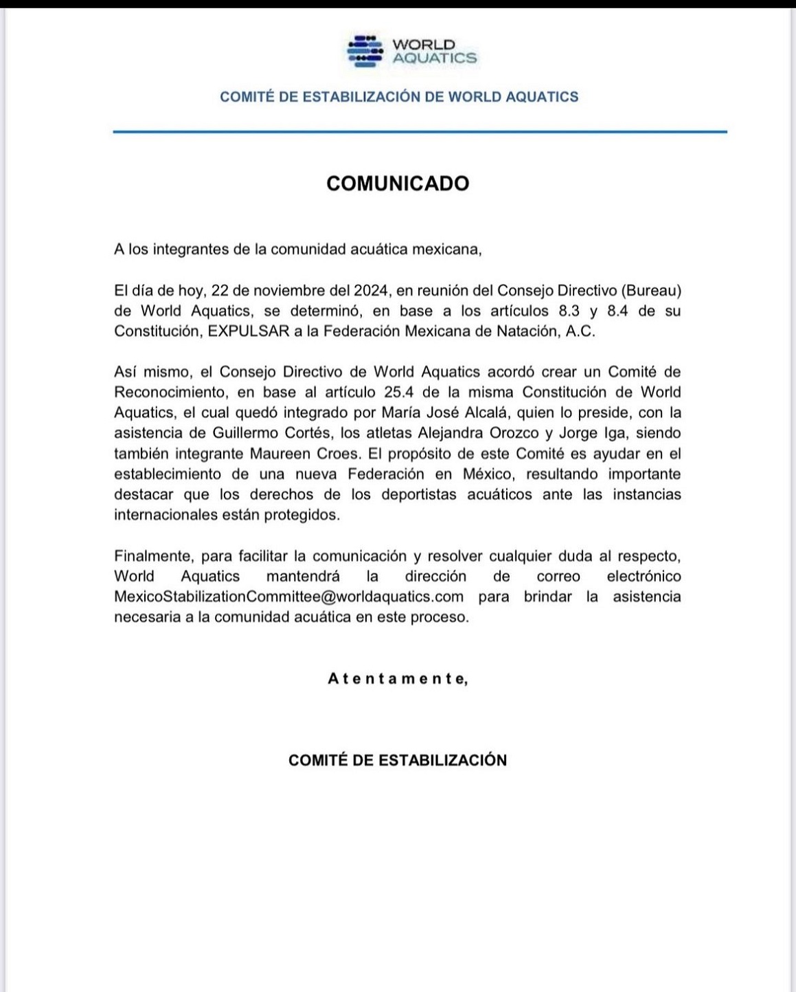 La World Aquatics aprueba crear un Comité de Reconocimiento, integrado por Marijose Alcalá, Alejandra Orozco, Jorge Iga y Guillermo Cortés, para establecer una nueva Federación de Natación en México ajena a Kiril Todorov.