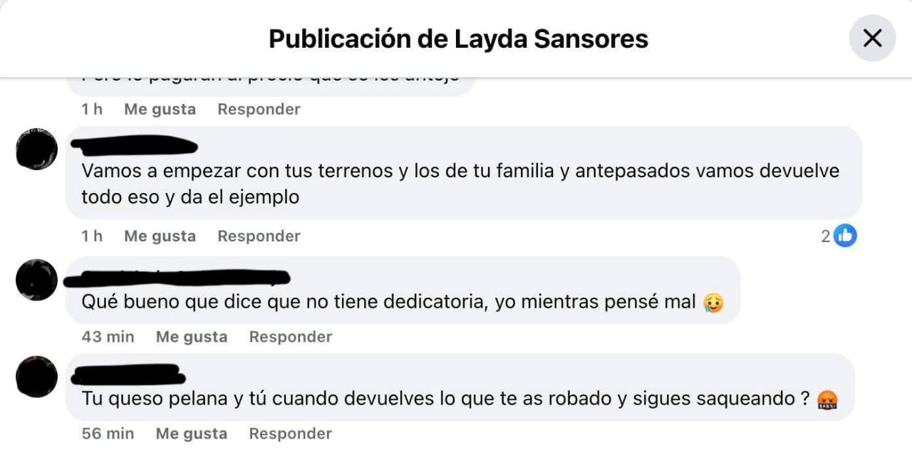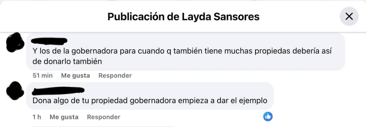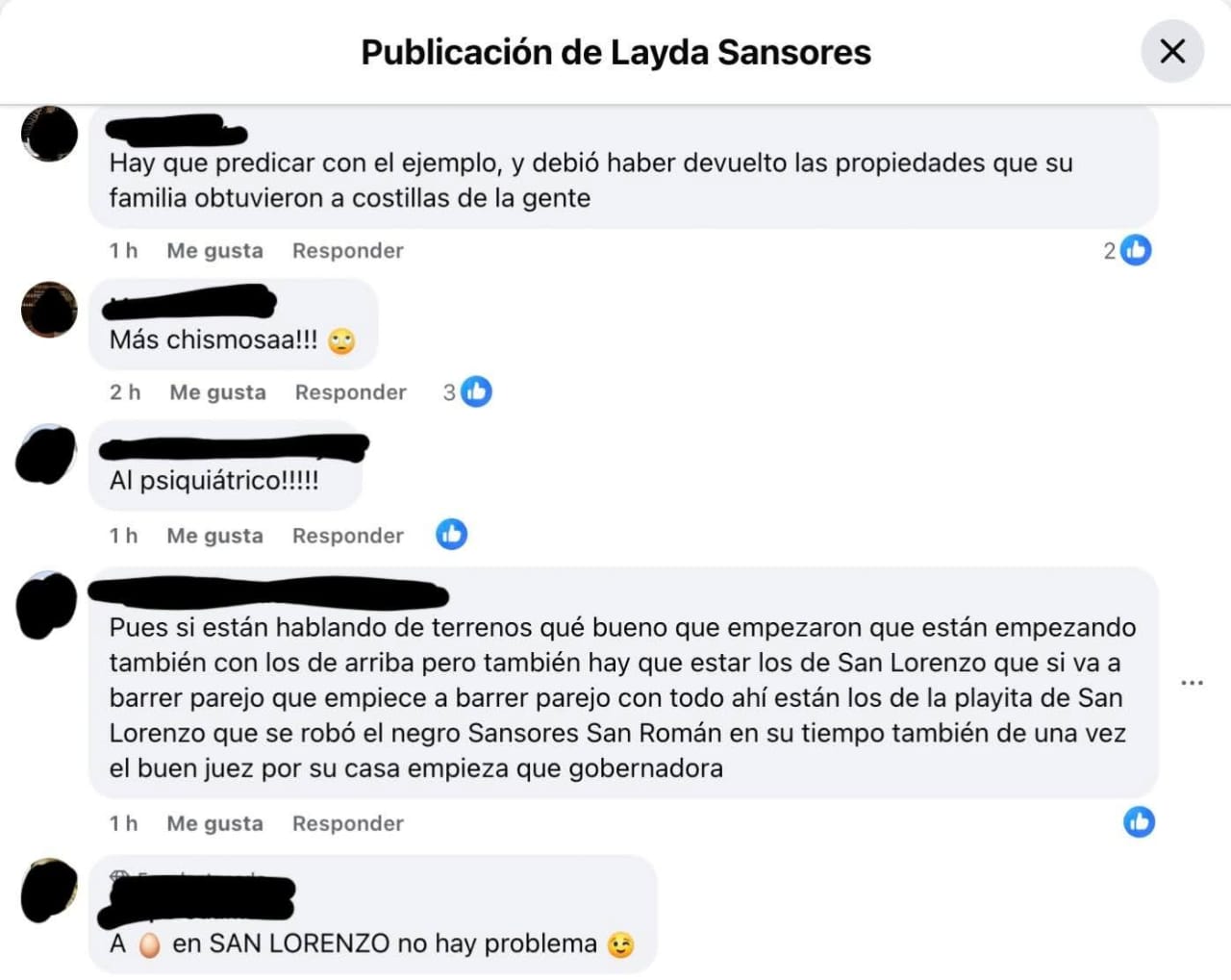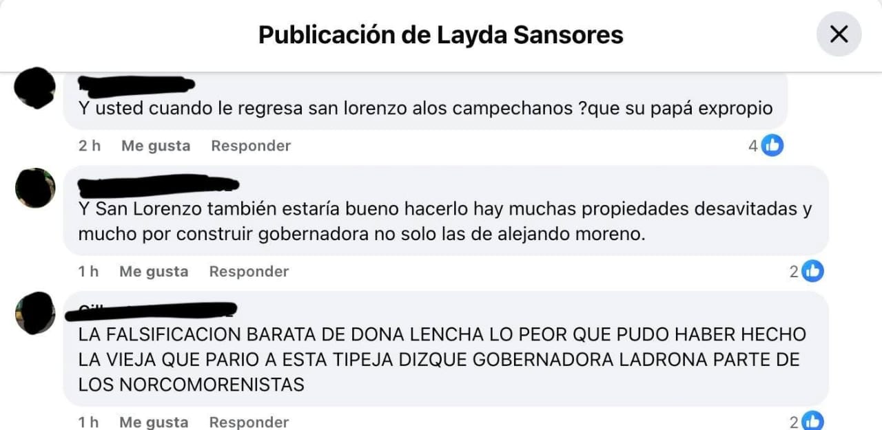Entre los comentarios más señalados destacaron reclamos directos, como el siguiente: “Pues ya es tiempo de que devuelvas los terrenos que los Sansores se agarraron” y “Cuando te toque no llores, todo Campeche sabe que tienes mucho terreno y playa que no compraste”.