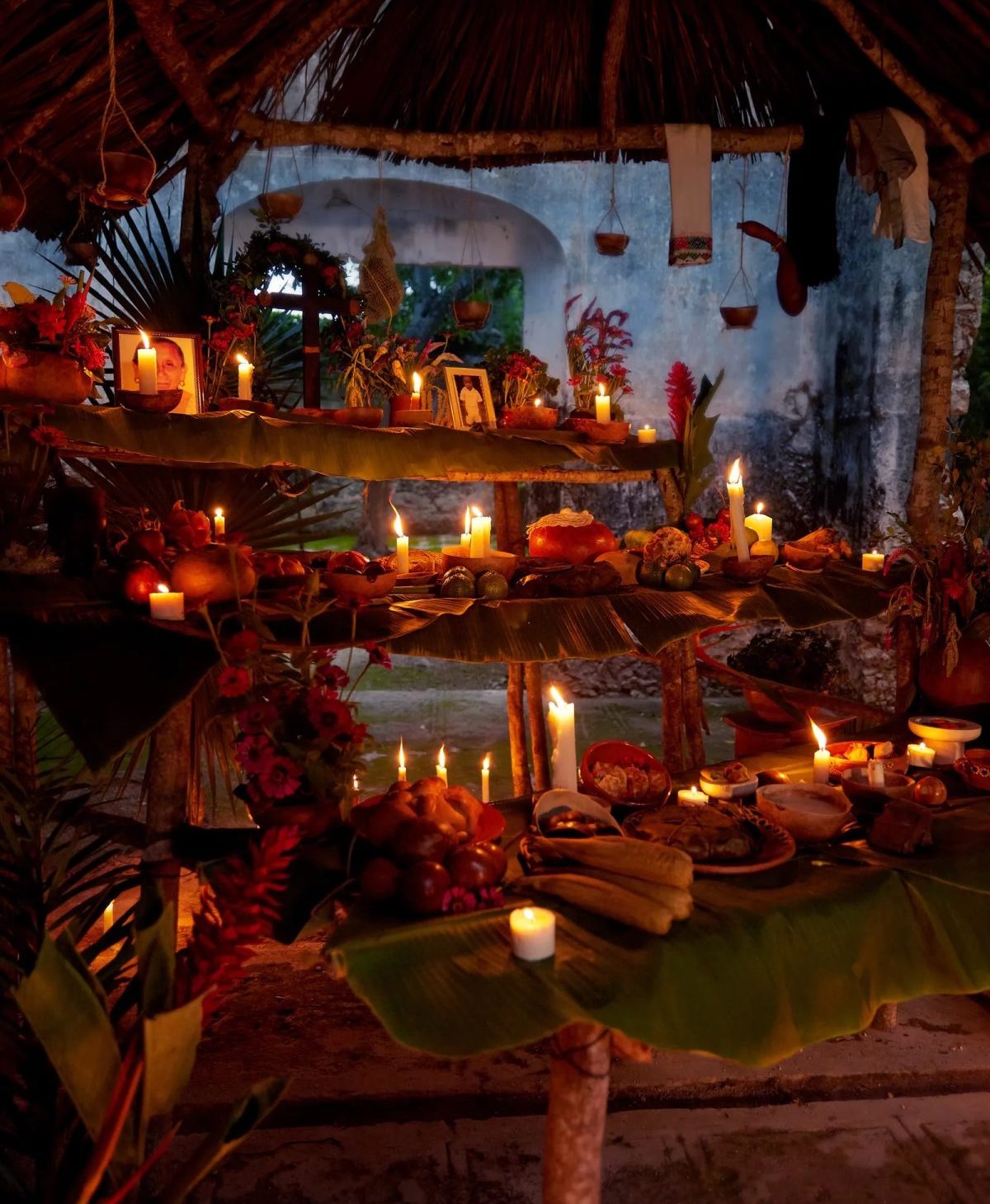 Junto a él se ofrecen jícamas, naranjas, dulces de papaya y el sagrado balché, bebida fermentada que simboliza el vínculo entre el mundo terrenal y el espiritual.