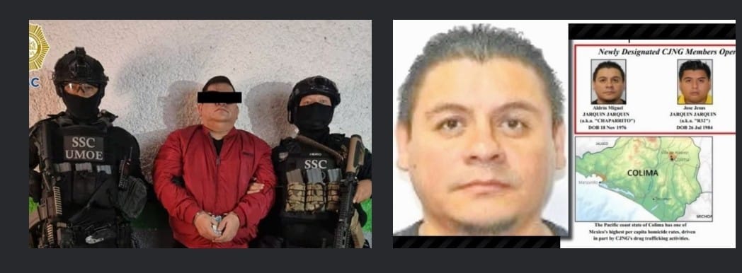Para el 19 de agosto del 2024 fue detenido en Mérida, Aldrin Miguel Jarquín Jarquín alias “El Chaparrito”, Jefe de la Plaza en Colima del CJNG quien fue trasladado a la ciudad de México por la FGR; se dijo que el Jefe de la Plaza Regional fue detenido en Zapopan, Jalisco el 13 de marzo del año 2022, pero un juez decretó la libertad el 4 de junio bajo el exhorto a que se presentara a la audiencia de imputación por el cargo de delincuencia organizada, pero jamás lo hizo y huyó con dirección a Yucatán.
