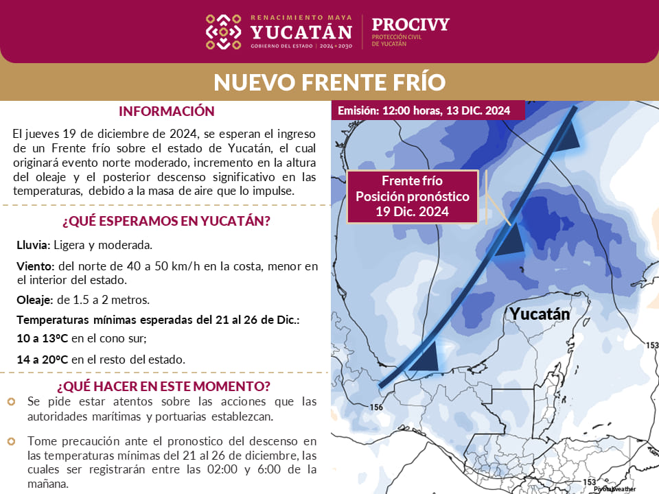 MÉRIDA,YUC.-13 de diciembre.-La entrada de un nuevo Frente Frío en Yucatán ocasionará que el termómetro descienda hasta los 10 grados Celsius durante la semana de Navidad, desde el sábado 21 hasta el jueves 26 de diciembre, pronosticó la Coordinación de Protección Civil (PROCIVY) Yucatán.