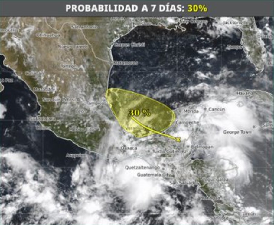 Tiene bajas probabilidades de desarrollo ciclónico, aunque saldrá al mar en la Bahía de Campeche.