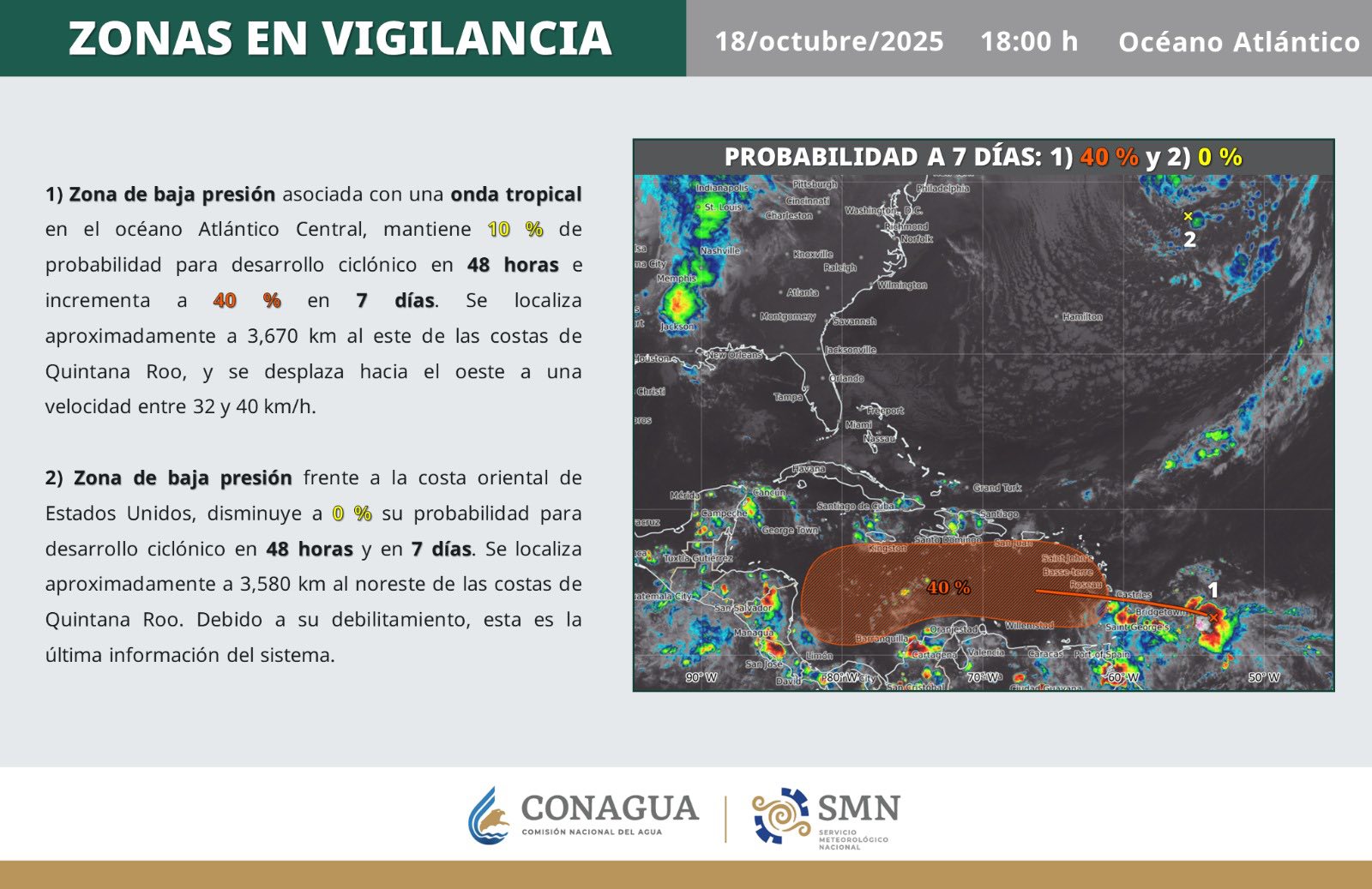 Medios internacionales también informan que sistemas similares (designados como “Invest 98L” u otros códigos de vigilancia) tienen probabilidades de desarrollo de entre 10 y 40 % en 7 días, lo cual se alinea con la evaluación para el que hoy monitorea Conagua.