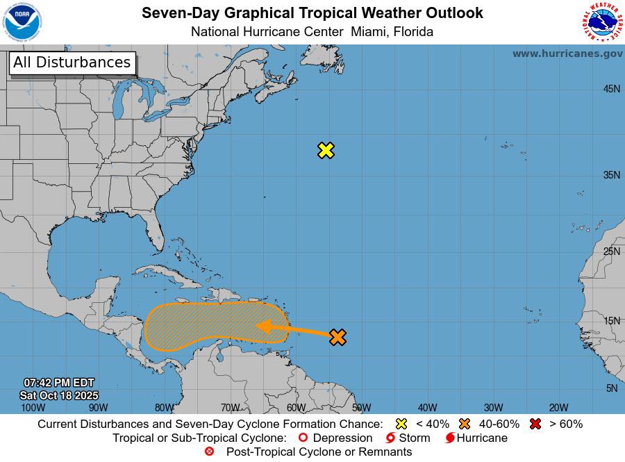 La temporada de ciclones atlánticos 2025 sigue activa y en vigilancia constante: una zona de baja presión vinculada a una onda tropical en el Atlántico tropical mantiene 10 % de probabilidad de desarrollarse en ciclón en las próximas 48 horas, cifra que podría subir a 40 % en el plazo de 7 días.